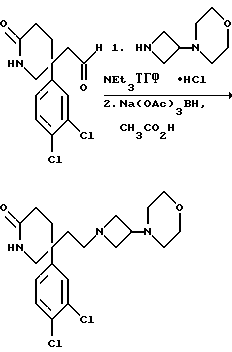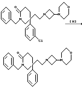 Таким образом, настоящее изобретение относитсяI) к фармацевтической композиции, содержащей соединение формулы (I), или его фармацевтически приемлемую соль, вместе с фармацевтически приемлемым разбавителем или носителем; II) к соединению формулы (I), или к его фармацевтически приемлемой соли, или к их композиции, для использования в качестве лекарственного средства; III) к применению соединения формулы (I), или его фармацевтически приемлемой соли, или их композиции, для производства лекарственного средства для лечения заболевания путем антагонистического действия на тахикинин, действующий в человеческом NK1-, NK2– или NK3-рецепторе или в их сочетании; IV) к применению в (III), когда заболевание представляет собой воспалительное заболевание, такое как артрит, псориаз, астма или воспалительное заболевание кишечника, расстройство центральной нервной системы (ЦНС), такое как страх, депрессия, деменция или психоз, желудочно-кишечное (GI) нарушение, такое как функциональная болезнь кишечника, синдром раздраженной толстой кишки, гастроэзофагеальный рефлюкс, недержание кала, колит или болезнь Крона, заболевание мочеполовых путей, такое как недержание, гиперрефлексия или цистит, легочное нарушение, такое как хроническая обструкция дыхательных путей, аллергию, такую как экзема, контактный дерматит или ринит, аллергическое расстройство, такое как вызванное сумахом, периферическую невропатию, такую как диабетическая невропатия, невралгия, каузалгия, болезненная невропатия, ожог, невралгия при опоясываюшем лишае или после опоясывающего лишая, кашель или острую или хроническую боль; V) к способу лечения человека, при котором болезнь лечится за счет антагонистического действия на тахикинин, действующий в человеческом NK1-, NK2– или NK3-рецепторе или в сочетании, который включает лечение упомянутого человека эффективным количеством соединения формулы (I), или его фармацевтически приемлемой соли, или их композиции; VI) к способу (V), когда заболевание представляет собой воспалительное заболевание, такое как артрит, псориаз, астма или воспалительное заболевание кишечника, расстройство центральной нервной системы (ЦНС), такое как страх, депрессия, деменция или психоз, желудочно-кишечное (GI) нарушение, такое как функциональная болезнь кишечника, синдром раздраженной толстой кишки, гастроэзофагеальный рефлюкс, недержание кала, колит или болезнь Крона, заболевание мочеполовых путей, такое как недержание, гиперрефлексия или цистит, легочное нарушение, такое как хроническая обструкция дыхательных путей, аллергию, такую как экзема, контактный дерматит или ринит, аллергическое расстройство, такое как вызванное сумахом, периферическую невропатию, такую как диабетическая невропатия, невралгия, каузалгия, болезненная невропатия, ожог, невралгия при опоясывающем лишае или после опоясывающего лишая, кашель или острую или хроническую боль; VII) к соединению формулы (II), (IIIA), (XII), (XIV), (XV), (XVI) (XVII), (XVIII), (XIX), (XX), (XXI), (XXII), (XXIII) или (XXIV). Ниже приводятся примеры получения соединений формулы (I). (Ссылочный) пример 1 5-(3,4-Дихлорфенил)-5-(2-[-морфолиноазетидин-1-ил]этил)-2(1H)- пиперидон ![]() К раствору альдегида (см. препаративный пример 6) (150 мг, 0,52 ммоль) и гидрохлорида 3-морфолиноазетидина (см. препаративный пример 56) (103 мг, 1,1 мол. экв. ) в тетрагидрофуране (7,5 мл) в атмосфере азота добавляю