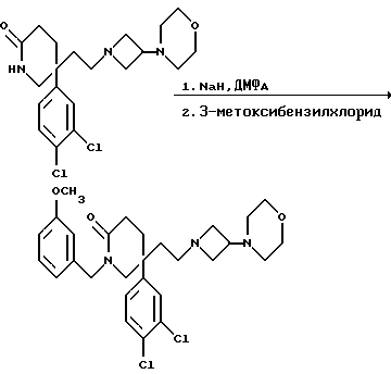 Пример 605-(3,4-Дихлорфенил)-1-(3-метоксибензил)-5-(2-[3-морфолиноазетидин- 1-ил] этил)-2-пиперидон ![]() К раствору пиперидона (см. пример 1) (350 мг, 0,85 ммоль) в сухом N,N-диметилформамиде (5 мл) в атмосфере азота добавляют 60% (в/в) дисперсию гидрида натрия в масле (37 мг, 1,05 мол. экв.), и смесь перемешивают при комнатной температуре в течение 30 минут. После этого добавляют 3-метоксибензилхлорид (0,13 мл, 1,05 мол. экв.), и смесь перемешивают в течение 5 минут. Затем добавляют воду (1 мл), и после этого добавляют насыщенный водный раствор бикарбоната натрия (20 мл) и насыщенный водный раствор хлорида аммония (20 мл). Смесь экстрагируют этилацетатом (2 х 20 мл), и объединенные органические слои промывают насыщенным водным раствором хлорида аммония (2 х 20 мл) и затем сушат над сульфатом магния. После фильтрации и удаления из фильтра растворителя при пониженном давлении получают смолу, которую хроматографируют на силикагеле, элюируя с градиентом растворителя метанола с дихлорметаном (от 1: 19 до 1:9, по объему). Получают названное в заголовке соединение (140 мг). ТХС Rf = 0,45 (диоксид кремния, метанол : дихлорметан, 1:9, по объему). МСНР m/z = 532 (m)+. Элем. анализ: найдено: C – 62,07; H – 6,74; N – 7,19. Для C28H35Cl2N3O3 0,1CH2Cl2 вычислено: C – 62,39; H – 6,56; N – 7,77%.