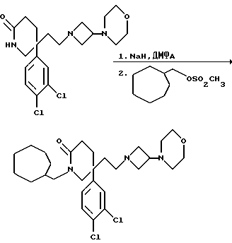 Примеры с 61 по 75Соединения общей формулы: ![]() примеров, перечисленных ниже в табл. 2, получают способом, подобным способу примера 60 (с нагреванием реакционной смеси, при необходимости), используя в качестве исходных веществ соответствующий пиперидон (см. пример 1) и хлор-, бром- или метансульфонилоксиалкановые производные. Подстрочные примечания 1. Две пары энантиомеров в продукте, полученном после обработки, разделяют хроматографией на силикагеле, элюируя с градиентом растворителя метанола с дихлорметаном (от 1: 19 до 1:9, по объему). Сначала элюируется энантиомерная пара А, а затем более полярная энантиомерная пара B. 2. В качестве исходного вещества используют хлоралкановое производное. 3. В качестве исходного вещества используют бромалкановое производное. 4. В качестве исходного вещества используют метансульфонилоксиалкановое производное. Пример 76 1-Циклогептилметил-5-(3,4-дихлорфенил)-5-(2-[3-морфолиноазетидин- 1-ил] этил)-2-пиперидон ![]() К раствору пиперидона (см. пример 1) (200 мг, 0,49 моль) в сухом N,N-диметилформамиде (3,5 мл), при 0oC и в атмосфере азота добавляют 60% (в/в) дисперсию гидрида натрия в масле (21 мг, 1,1 мол. экв.), и смеси позволяют нагреваться до комнатной температуры в течение 1 часа. После этого добавляют раствор метансульфонилоксиметилциклогептана (см. препаративный пример 13) (120 мг, 1,2 мол. экв. ) в сухом N,N-диметилформамиде (0,5 мл), и смесь нагревают до 50oC. Для осуществления полного взаимодействия исходного пиперидона смесь охлаждают, затем добавляют дополнительные порции гидрида натрия (0,5 мол. экв.) и исходного мезилата 0,5 мол. экв.), и реакционную смесь греют при 50oC в течение 2 часов. Реакционную смесь охлаждают до 0oC, добавляют воду (1 мл) и удаляют диметилформамид при пониженном давлении. Остаток экстрагируют этилацетатом (3 х 20 мл), и объединенные экстракты сушат над сульфатом магния. После фильтрации и удаления из фильтрата растворителя при пониженном давлении получают пену, которую хроматографируют, используя силикагель, элюируя с градиентом растворителя дихлорметана с метанолом (от 100:0 до 85:15, по объему), и получают названное в заголовке соединение (120 мг). ТХС Rf = 0,45 (диоксид кремния, метанол:дихлорметан, 1:9, по объему). МСНР m/z = 522 (m+1)+. Элем. анализ: найдено: C – 62,11; H – 7,63; N – 7,55. Для C28H41Cl2N3O2 0,2CH2Cl2 вычислено: C – 62,78; H – 7,73; N – 7,79%.