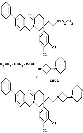 Пример 775-(3,4-Дихлорфенил)-5-(2-[3-морфолиноазетидин-1-ил] этил)-1-(4- фенилбензил)-2-пиперидон ![]() К раствору мезилата (см. препаративный пример 35) (290 мг, 0,55 ммоль) в сухом ацетонитриле (10 мл) добавляют дигидрохлорид 3-морфолиноазетидина (см. препаративный пример 56) (200 мг, 2,0 мол. экв.), после чего добавляют триэтиламин (0,15 мл, 2 мол. экв.) и карбонат калия (150 мг, 2 мол. экв.). Смесь кипятят с обратным холодильником в течение 4 часов. После этого реакционную смесь охлаждают, добавляют воду (1 мл), смесь упаривают досуха при пониженном давлении, и остаток обрабатывают смесью дихлорметана (10 мл) и воды (10 мл). Органическую фазу отделяют, промывают солевым раствором (10 мл), сушат над сульфатом магния, фильтруют и из фильтрата при пониженном давлении удаляют растворитель. Получают смолу, которую хроматографируют на силикагеле, элюируя с градиентом растворителя метанола с дихлорметаном (от 1: 19 до 1:9, по объему, и получают названное в заголовке соединение (85 мг). ТХС Rf = 0,47 (диоксид кремния, метанол:дихлорметан, 1:9, по объему), т. пл. 72-82oC. МСНР m/z = 578 (m+1)+. Элемен. анализ: найдено: C – 67,56; H – 6,27; N – 7,24. Для C33H37Cl2N3O2 0,13CH2Cl2 вычислено: C – 67,53; H – 6,37; N – 7,13%.