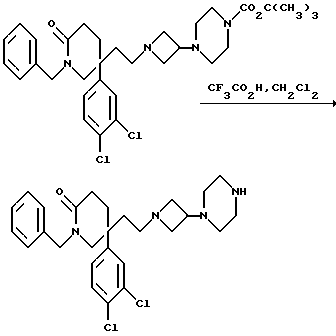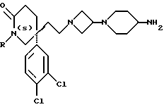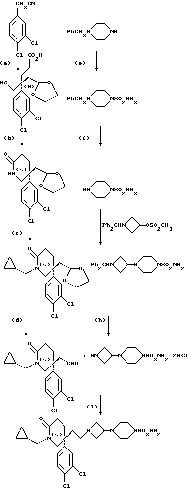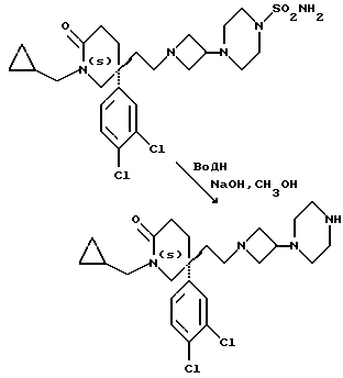i) 5(S)-5-(2-[3 (4-Аминосульфонилпиперазин-1-ил) азетидин-1-ил]этил)-1-циклопропилметил-5-(3,4-дихлорфенил)-2-пиперидонК раствору соединения примера 123 (h) (18,97 г) в тетрагидрофуране (140 мл) при комнатной температуре добавляют триэтиламин (18 мл), и смесь перемешивают в течение 30 минут. Затем добавляют раствор соединения примера 123 (d) (20 г) в тетрагидрофуране (60 мл). Через 2 часа раствор охлаждают до 2oC, и добавляют порциями триацетоксиборогидрид натрия (17,44 г), после чего добавляют уксусную кислоту (3,37 мл), и реакционной смеси дают возможность нагреваться до комнатной температуры и перемешивают в течение 2 часов. Реакционную смесь выливают в воду (50 мл), и добавляют 10% (в/в) водный раствор бикарбоната натрия до достижения pH 9. Добавляют этилацетат (200 мл), и слои разделяют. Водную фазу экстрагируют этилацетатом (50 мл), объединенные органические экстракты промывают 10% (в/в) водным раствором бикарбоната натрия (100 мл), и удаляют растворитель при пониженном давлении. Получают названное в заголовке соединение (28,27 г). 1H ЯМР – как для соединения примера 32. Фармакологические результаты Выбранные представители соединений примеров проверяются in vitro на их аффинность к человеческому NK2-рецептору путем проверки их способности конкурировать с [125I] NKA при связывании с мембранами, полученными из клеток яичника китайского хомяка, экспрессирующих клонированный человеческий NK2-рецептор (способ А), и по их способности противодействовать сократительному действию [ Ala8] NKA(4-10) в легочной артерии кролика (способ В), в соответствии со способами, описанными на сс. 46 и 48 описания.