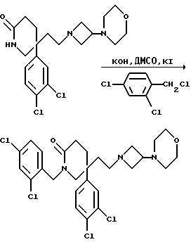 Пример 991-(2,4-Дихлорбензил)-5-(3,4-дихлорфенил)-5-(2-[3-морфолиноазетидин- 1-ил]этил)-2-пиперидон ![]() К раствору измельченного в порошок гидроксида калия (110 мг, 4 мол. экв. ) в сухом диметилсульфоксиде (4 мл), при перемешивании, добавляют раствор пиперидона (см. пример 1) (200 мг, 0,49 ммоль) в сухом диметилсульфоксиде (4 мл) и затем добавляют 2,4-дихлорбензилхлорид (0,068 мл, 1 мол. экв.) и иодид калия (8 мг, 0,1 мол. экв.). Затем смесь перемешивают при комнатной температуре в течение 16 часов. Затем добавляют этилацетат (50 мл), смесь промывают водой (3 х 50 мл) и органическую фазу сушат над безводным сульфатом магния. Затем раствор фильтруют, растворитель из фильтрата удаляют при пониженном давлении, остаток хроматографируют, используя силикагель, элюируя с градиентом растворителя этилацетата с метанолом и диэтиламином (от 100:0:0 до 100:5:1, по объему). Получают названное в заголовке соединение (49 мг). МСНР m/z = 572 (m+1)+. 1H ЯМР (CDCl3): = 1,55-1,8 (м, 2H), 1,95-2,3 (м, 10H), 2,4-2,5 (м, 1H), 2,65-2,7 (м, 1H), 2,85-2,9 (м, 1H), 3,3-3,4 (м, 3H), 3,6-3,7 (м, 5H), 4,6 (д, 1H), 4,85 (д, 1H), 6,9-6,95 (м, 1H), 7,05 (м, 1H), 7,2-7,4 (м, 4H) ppm.