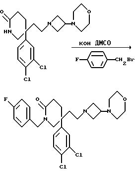 Пример 1005-(3,4-Дихлорфенил)-1-(4-фторбензил)-5-(2-[3-морфолиноазетидин- 1-ил]этил)-2-пиперидон ![]() К сухому диметилсульфоксиду (3 мл) при комнатной температуре добавляют порошкообразный гидроксид калия (104 мг, 4 мол. экв.), и смесь перемешивают при комнатной температуре в течение 5 минут. Затем добавляют раствор пиперидона (см. пример 1) (240 мг, 0,46 ммоль) в диметилсульфоксиде (5 мл), и после этого добавляют 4-фторбензилбромид (0,058 мл, 1 мол. экв.), и смесь перемешивают при комнатной температуре в течение 50 минут. Затем реакционную смесь выливают в этилацетат (40 мл), промывают водой (3 х 40 мл), и органическую фазу сушат над безводным сульфатом магния. Затем раствор фильтруют, из фильтрата при пониженном давлении удаляют растворитель, и остаток хроматографируют на силикагеле, элюируя с градиентом растворителя этилацетата с метанолом и диэтиламином (от 100:0:0 до 10:1:2 и до 20:3:1, по объему). Получают названное в заголовке соединение (100 мг). МСНР m/z = 521 (m+1)+. TXC Rf = 0,4 (диоксид кремния, этилацетат:метанол: диэтиламин 20: 30:1, по объему). Элем. анализ: найдено: C – 61,46; H – 6,27; N – 7,55. Для C27H32Cl2N3O2F вычислено: C – 62,31; H – 6,20; N – 8,07%. 1H ЯМР (CDCl3): = 1,5-1,85 (м, 4H), 1,95-2,2 (м, 8H), 2,6-2,75 (м, 2H), 2,8-2,9 (м, 1H), 3,15-3,35 (м, 4H), 3,65-3,75 (м, 4H), 4,3 (д, 1H), 4,8 (д, 1H), 6,8-7,3 (м, 7H) ppm.