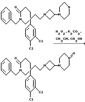 Примеры 101 и 102Соединения двух следующих сведенных в табл. 4 примеров, имеющие общую формулу: ![]() получают способом, подобным способу примера 100, используя в качестве исходных соединений тот же пиперидон и 3,5-ди-(трифторметил)бензобромид или 2-метансульфонилоксиэтил-циклопропан (см. препаративный пример 157), соответственно. Пример 103 1-Бензил-5-(3,4-дихлорфенил)-5-(2-[3-(1-оксотиоморфолино)- азетидин-1-ил]этил)-2-пиперидон ![]() К охлажденному льдом раствору метанола (7 мл), тиоморфолина (см. пример 2) (0,76 мл, 1,0 мол. экв.), ацетонитрила (0,09 г, 1,5 мол. экв.) и карбоната калия (0,147 г, 0,72 мол. экв.) добавляют, в течение 30 минут, 30% (в/о) раствор пероксида водорода в воде (0,175 г, 1,05 мол. экв.) в метаноле (5 мл). Реакционную смесь перемешивают при 0oC в течение 2 часов и затем позволяют нагреваться до комнатной температуры и перемешивают еще в течение 16 часов. Затем удаляют большую часть растворителя при пониженном давлении при комнатной температуре. Добавляют насыщенный водный раствор бикарбоната натрия (20 мл), и смесь экстрагируют этилацетатом (3х50 мл). Объединенные органические слои сушат над сульфатом магния и упаривают при пониженном давлении. Полученное масло очищают колоночной флэш-хроматографией на силикагеле, элюируя метанолом с дихлорметаном (1:9, по объему), и получают названное в заголовке соединение (121 мг). ТХС Rf= 0,10 (диоксид кремния, метанол: дихлорметан, 1 : 9, по объему). МСНР m/z = 534 (m+1)+. Элем. анализ: найдено: С – 57,91; Н – 5,77; N – 7,58. Для C27H33N3Cl2O2S 0,37CH2Cl2 вычислено: C – 58,05; H – 6,01; N – 7,42%.