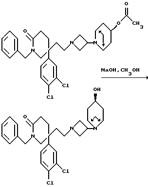 Пример 1041-Бензил-5-(3,4-дихлорфенил)-5-(2-[3-(эндо-3-гидрокси-8- азабицикло[3,2,1] окт-8-ил)-азетидин-1-ил]этил)-2-пиперидон ![]() Смесь пиперидона (см. пример 24) (78 мг), 6N водного раствора гидроксида натрия (0,5 мл) и метанола (1,5 мл) перемешивают при комнатной температуре в течение 16 часов. Раствор концентрируют при пониженном давлении, и затем добавляют воду (5 мл) и дихлорметан (10 мл). Слои разделяют, и водную фазу затем экстрагируют дихлорметаном (2х10 мл). Объединенные органические слои сушат над безводным сульфатом натрия и затем фильтруют. Удаляют растворитель из фильтрата при пониженном давлении, и получают названное в заголовке соединение в виде белой пены (67 мг). МСНР m/z = 543 (m+1)+. Элем. анализ: найдено: C – 62,15; Н – 6,11; N – 7,43. Для C30H39Cl2N3O 0,56CH2Cl2 вычислено: C – 62,40; H – 6,87; N – 7,16%.