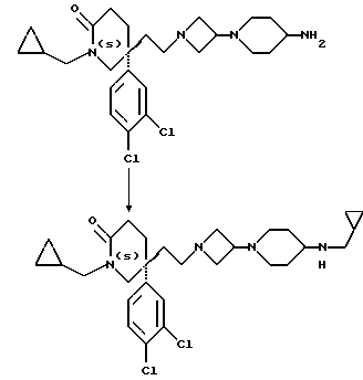 Препаративный пример 1375(S)-1-Циклопропилметил-5-(3,4-дихлорфенил)-5- формилметил-2-пиперидон В раствор соединения препаративного примера 141 (0,763 г, 1 мол. экв.) в метаноле (24 мл), в атмосфере азота при -78oC, в течение 30 минут пропускают озон со скоростью 50 мл/мин (используя заряд 1,5 А для генерации озона из кислорода). После этого снижают силу тока до нуля, и через реакционную смесь в течение 2 минут пропускают кислород со скоростью 5 мл/мин. Затем прекращают пропускать кислород, и через реакционную смесь в течение 20 минут пропускают азот. После этого осторожно, по каплям, добавляют раствор диметилсульфида (1,7 мл, 10 мол. экв.) в метаноле (3,5 мл), и реакционную смесь оставляют нагреваться до комнатной температуры в течение 18 часов. Растворитель удаляют при пониженном давлении, и реакционную смесь обрабатывают этилацетатом (20 мл) и водой (15 мл). Органический слой отделяют, и водный слой дополнительно экстрагируют этилацетатом (2х20 мл). Органические слои затем объединяют, сушат, используя сульфат натрия, фильтруют, и упаривают фильтрат досуха при пониженном давлении. Получают названное в заголовке соединение (0,69 г), которое используют без дополнительной очистки. ТСХ Rf = 0,31 (диоксид кремния, этилацетат). МСНР m/z = 340 (m)+. 1H ЯМР (CDCl3): = 0,2 – 0,4 (м, 2H), 0,5 – 0,7 (м, 2H), 1,0 – 1,15 (м, 1H), 2,0 – 2,25 (м, 2H), 2,3 – 2,45 (м, 1H), 2,6 – 2,8 (м, 1H), 2,9 – 3,05 (м, 1H), 3,1 – 3,2 (м, 1H), 3,4 – 3,6 (м, 2H), 3,9 – 4,0 (м, 1H), 4,05 – 4,15 (м, 1H), 7,15 – 7,2 (м, 1H), 7,3 – 7,5 (м, 2H), 9,5 (с, 1H) ppm.