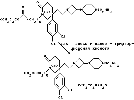 Примеры 107 и 108Соединения двух следующих, сведенных в табл. 5 примеров, имеющие общую формулу: ![]() получают способом, подобным способу примера 106, используя в качестве исходных соединений соответствующий амин (см. примеры 105 и 113) и циклопропилкарбоксальдегид. Пример 109 Дитрифторацетат 5(S)-5-(2-[3-(4-аминосульфонилпиперазин-1- ил)азетидин-1-ил]этил)-1-(5-карбоксипентил)-5-(3,4-дихлорфенил)-2- пиперидона ![]() К раствору соединения примера 57 (30 мг, 0,045 ммоль) в дихлорметане (1 мл), при 0oC и в атмосфере азота, добавляют трифторуксусную кислоту (0,05 мл). Смесь перемешивают в течение 2 часов при комнатной температуре. Растворитель дихлорметан удаляют при пониженном давлении, и получают смолу, которая кристаллизуется после обработки диэтиловым эфиром, и после фильтрации получают названное в заголовке соединение в виде белого твердого вещества (20 мг). ТХС Rf = 0,48 (диоксид кремния, метанол : дихлорметан, 1 : 9, по объему). МСНР m/z = 604 (m+1)+. Элем.анализ: найдено: C – 42,47; Н – 4,73; N – 7,90. Для C26H39Cl2N5O5S 2CF3CO2H H2O вычислено: C – 42,46; Н – 4,88; N – 8,25%.