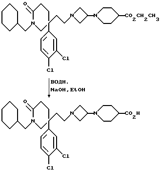 Пример 1105-(2-[3-(4-Карбоксипиперидин-1-ил)-азетидин-1-ил] этил)-1- циклогексилметил-5-(3,4-дихлорфенил)-2-пиперидон ![]() К раствору соединения примера 95 в этаноле (1 мл) добавляют 1N водный раствор гидроксида натрия (0,24 мл), и смесь перемешивают при комнатной температуре в течение 16 часов. Этанол удаляют при пониженном давлении, и к остатку добавляют воду (1 мл). Доводят pH раствора до 5, используя 2N водный раствор хлористоводородной кислоты, и получают масло, которое кристаллизуется при царапании. Получающееся в результате твердое вещество отфильтровывают, обрабатывают водой (2х3 мл) и затем диэтиловым эфиром (3х3 мл), затем сушат при пониженном давлении при 70oC и получают названное в заголовке соединение (40 мг). МСНР m/z = 550 (m+1)+. Элем. анализ: найдено: C – 55,80; Н – 7,14; N – 6,44. Для C29H41N3Cl2O3 0,75H2O NaCl вычислено: C – 55,95; Н – 6,88; N – 6,75%.