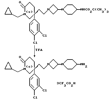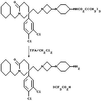 Пример 1115-(S)-(2-[3-(4-Карбоксипиперидин-1-ил)-азетидин-1-ил] этил)-1-циклопропилметил-5-(3,4-дихлорфенил)-2-пиперидон Это соединение получают способом, подобным способу примера 110, используя в качестве исходного вещества соответствующий метиловый эфир (см. пример 59) и 3,8 мол. экв. водного раствора гидроксида натрия. МСНР m/z = 508 (m)+. Пример 112 Тритрифторацетат 5(S)-5-(2-[3-(4-аминопиперидин-1-ил)-азетидин-1- ил]этил)-1-циклопропилметил-5-(3,4-дихлорфенил)-2-пиперидона ![]() К раствору соединения примера 48 (1,4 г, 24,1 ммоль) в дихлорметане (20 мл), при +4oC и в атмосфере азота, добавляют трифторуксусную кислоту (6,6 мл), и реакционную смесь перемешивают при комнатной температуре в течение 1 часа. Растворитель и избыток трифторуксусной кислоты удаляют при пониженном давлении, и получают названное в заголовке соединение (907 мг). МСНР m/z = 479 (m+1)+. Примеры со 113 по 115 Соединения приведенных ниже, сведенных в табл. 6 примеров, имеющие общую формулу: ![]() получают способом, подобным способу примера 112, используя соответствующий, защищенный трет-бутоксикарбонилом амин (см. примеры 46, 51 и 54) и трифторуксусную кислоту. Пример 116 Тритрифторацетат 5-(2-[3-(4-аминопиперидин-1-ил)-азетидин-1-ил] этил)-1-циклогексилметил-5-(3,4-дихлорфенил)-2 пиперидона ![]() К раствору соединения примера 96 (0,53 г, 0,85 ммоль) в дихлорметане (5 мл), при 0oC и в атмосфере азота, постепенно добавляют трифторуксусную кислоту, и раствор перемешивают при комнатной температуре в течение 1 часа. Избыток трифторуксусной кислоты и дихлорметан удаляют при пониженном давлении, остаток обрабатывают дихлорметаном (5 мл) и удаляют растворитель при пониженном давлении. Остаток обрабатывают диэтиловым эфиром, фильтруют, и полученное твердое вещество быстро промывают диэтиловым эфиром, затем сушат при пониженном давлении при 70oC и получают названное в заголовке соединение (580 мг). МСНР m/z = 522 (m+1)+. H1 ЯМР (CDCl3)/ d6-ДМСО: = 0,75 – 0,9 (м, 2Н), 0,95 – 1,1 (м, 3Н), 1,35 – 4,0 (м, 32Н), 6,95 -7,0 (м, 1H), 7,15- 7,20 (м, 1H), 7,30 – 7,35 (м, 1H), 8,35 (ш, с, 2Н) ppm.
