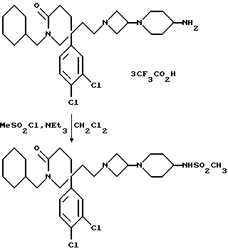 Препаративный пример 55-(3,4-Дихлорфенил)-5-(2-метансульфонилоксиэтил)-2(1H)-пиперидон К насыщенному раствору соединения препаративного примера 4 (5,44 г, 18,9 ммоль) в сухом дихлорметане (100 мл) добавляют триэтиламин (3,95 мл, 1,5 мол. экв.), и раствор охлаждают до 0oC. Затем добавляют метансульфонилхлорид (1,9 мл, 1,3 мол. экв.), и реакционной смеси дают возможность нагреваться до комнатной температуры и перемешивают в течение 2,5 часов. Реакционную смесь промывают водой (3х200 мл), сушат над сульфатом магния, фильтруют, и удаляют растворитель при пониженном давлении. Получают названное в заголовке соединение (7,1 г). ТХС Rf = 0,24 (диоксид кремния, метанол : дихлорметан, 1 : 19, по объему). 1H ЯМР (CDCl3): = 2,0 – 2,5 (м, 6Н), 2,9 (с, 3Н), 3,45 – 4,1 (м, 4Н), 6,7 (с, ш, 1Н), 7,2 – 7,5 (м, 3Н) ppm.