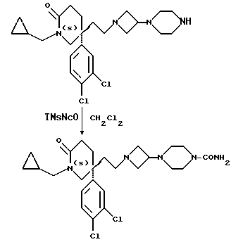 Пример 1195(S)-5-(2-[3-(4-Карбамоилпиперазин-1-ил)азетидин-1-ил] этил)-1-(циклопропилметил)-5-(3,4-дихлорфенил)-2 пиперидон ![]() К раствору соединения примера 105 (100 мг, 0,2 ммоль) в дихлорметане (3 мл), при комнатной температуре и в атмосфере азота, добавляют триметилсилилизоцианат (0,032 мл), и смесь перемешивают при комнатной температуре в течение 16 часов. Растворитель удаляют при пониженном давлении, и продукт очищают колоночной хроматографией, используя силикагель, элюируя дихлорметаном с метанолом и концентрированным раствором аммиака (89 : 10 : 1, по объему). Получают названное в заголовке соединение (69 мг). ТХС Rf = 0,25 (диоксид кремния, дихлорметан : метанол : конц. раствор аммиака, 89 : 10 : 1, по объему). МСНР m/z = 508 (m+1)+. 1H ЯМР (CDCl3): = 0,25 – 0,4 (м, 2Н), 0,55 – 0,7 (м, 2Н), 0,95 – 1,1 (м, 1H), 1,6-1,9 (м, 2Н), 1,95 – 2,4 (м, 10Н), 2,7 – 2,75 (м, 2Н), 2,9 – 2,95 (м, 1H), 3,1- 3,2 (м, 1H), 3,35 – 3,5 (м, 8Н), 3,7 – 3,8 (м, 1H), 4,4 (ш, с, 2Н), 7,1 – 7,4 (м, 3Н) ppm.