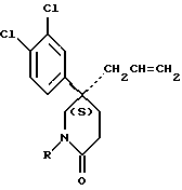 Препаративные примеры со 142 по 144Соединения следующих, сведенных в табл. 24 препаративных примеров, имеющие общую формулу; ![]() получают способом, подобным способу препаративного примера 141, используя в качестве исходных веществ тот же пиперидон и соответствующее бром- или п-толуолсульфонилоксиалкановое производное. Подстрочные примечания 1. В качестве исходного вещества используют бромалкановое производное. 2. В качестве исходного вещества используют п-толуолсульфонилоксиалкановое производное. Препаративный пример 145 5(S)-5-Аллил-5-(3,4-дихлорфенил)-2(1Н)-пиперидон Раствор соединения препаративного примера 146 (120 мг) в этаноле (5 мл) кипятят с обратным холодильником с концентрированной серной кислотой (0,4 мл) в течение 24 часов. Реакционную смесь разбавляют водой (5 мл) и подщелачивают, используя карбонат натрия. Раствор экстрагируют этилацетатом (2х10 мл). Объединенные органические слои сушат, используя безводный сульфат магния, фильтруют, и фильтрат упаривают досуха при пониженном давлении. Остаток хроматографируют на силикагеле, элюируя с градиентом растворителя дихлорметана с метанолом (от 100 : 0 до 97 : 3 и до 95 : 5, по объему). Получают названное в заголовке соединение (10 мг). МСНР m/z = 284 (m+1)+. ТСХ Rf = 0,4 (диоксид кремния, CH2Cl2 : CH3OH, 95 : 5 по объему). [ ]25589 = 31,2o (c = 0,00125).