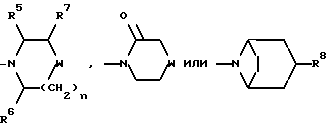 Препаративный пример 1684-(трет-Бутилокси) пиперидин Соединение препаративного примера 167 (8,41 г, 28,8 ммоль) растворяют в этаноле (100 мл) и добавляют 10% (в/в) палладий-на-угле (0,34 г). Смесь перемешивают в атмосфере водорода при давлении 414 кПа (60 ф/д2) в течение 24 часов. Катализатор отфильтровывают, и растворитель из фильтрата удаляют при пониженном давлении. Получающееся в результате масло очищают колоночной хроматографией на силикагеле, элюируя смесью концентрированного водного раствора аммиака с метанолом и дихлорметаном (1 : 10 : 89, по объему). Получают названное в заголовке соединение (2,48 г). ТСХ Rf = 0,23 (диоксид кремния, конц. водн. р-р аммиака : метанол : дихлорметан, 1 : 10 : 89, по объему). МСНР m/z = 158 (m+1)+. Препаративный пример 169 1-(трет-Бутоксикарбонил)-3-(1-пиперазинил) азетидин Расплавляют пиперазин (23,69 г, 8 мол. экв.), и добавляют 1-(трет-бутоксикарбонил)-3-метансульфонилоксиазетидин (см. публикацию заявки на международный патент ВОИС93/19059) (8,64 г, 34,4 ммоль). Смесь нагревают при 120oC в течение 15 часов в атмосфере азота. Реакционную смесь охлаждают до комнатной температуры, и избыток пиперазина удаляют при пониженном давлении. Остаток затем хроматографируют на силикагеле, используя градиент элюирования (метанол : дихлорметан, изменение от 1 : 19 до 1 : 4, по объему), и получают названное в заголовке соединение (6,32 г). МСНР m/z = 242 (m+1)+. 1H ЯМР (CDCl3): = 1,35 (с, 9Н), 2,4 – 2,5 (м, 4Н), 3,0 – 3,1 (м, 5Н), 3,2 – 4,2 (м, ш, 5Н) ppm.
