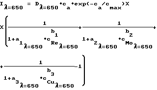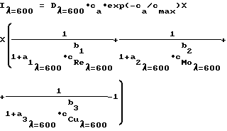 xb), где I – интенсивность люминесценции самария с добавлением тушителя люминесценции; I0 – интенсивность люминесценции самария в отсутствие тушителя; x – содержание оксида меди, оксида рения или оксида молибдена в стекловидном образце (мас. %); а и b – константы тушения, с последующим составлением системы уравнений, характеризующих интенсивность излучения анализируемого образца при длинах волн, соответствующих аналитическим, и базирующихся на соотношении