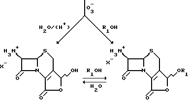 ![]() в которой Ac обозначает ацильную группу. Попытки превратить эти гидроксилактоны в соль изомера 7-ациламино-3-формил-4-карбоновой кислоты формулы ![]() в которой Ac определено выше, a W обозначает катион, могут привести к распаду в результате кольцевого раскрытия лабильного – лактамного кольца, особенно в присутствии воды.
