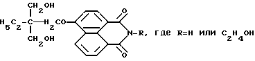 Изобретение относится к разработке красящей композиции для крашения в массе полиэтилена (ПЭ), полипропилена (ПП), пластифицированного поливинилхлорида (ПВХ), полистирола (ПС) и его сополимеров, полиамида, полиэфира. Окрашивающие материалы для указанных пластиков должны обладать высокой термостойкостью, хорошо совмещаться с окрашиваемым полимером и равномерно в нем распределяться, иметь высокую яркость в окрашиваемых материалах, обладать высокой миграционной устойчивостью. Так, известны миграционноустойчивые красящие композиции различной цветовой гаммы для окрашивания полиэтилена, состоящие из смеси меламина, п-толуолсульфамида, натрия фосфорнокислого двузамещенного и люминофора (а.с. СССР N 1484826 С 09 К 11/06, 1986, ТУ 6-09-26-652-92). Недостатками этих композиций является низкая термостойкость. Так, при температуре выше 170oC эти композиции разлагаются с выделением формальдегида, что ограничивает их использование для узкого круга полимеров, которые имеют температуру переработки ниже температуры их разложения (полиэтилен), а также ухудшают экологию технологического процесса окрашивания пластмасс. Известен окрашивающий состав на основе полиэфирных смол для окрашивания полимеров, включающий триметилолпропан, фталевый ангидрид и краситель. Получают этот красящий состав сополиконденсацией указанных компонентов. Недостатком этих красящих составов является невозможность использования их для окрашивания полиолефинов из-за плохой совместимости и низкой миграционной устойчивости их в пластиках (а.с. N 1054367 С 09 К 9/02; C 08 J 63/68, 1982 г.). Известен состав для получения дневных флуоресцентных пигментов, включающий многоатомный спирт, бензолполикарбоновую кислоту и органический люминофор, содержащий метилольное производное 4-бутоксинафталимида общей формулы: ![]() и водорастворимый люминофор. Недостатком этих пигментов является плохая диспергируемость их в полиолефинах, приводящая к образованию большого числа включений по всей массе окрашиваемого полимера, ограниченность круга красителей, сложность технологического процесса получения (а. с. СССР N 1642742 С 09 В 69/10; С 09 К 11/06, 1987 г.). Наиболее близким составом к заявляемой красящей композиции по свойствам и области использования является композиционный состав для колорирования термопластов, включающий бензолполикарбоновую кислоту или ее ангидрид, многоатомный спирт, органический краситель или смесь красителей, содержащих в своей структуре активные группировки типа: -COOH; ; -NH2; -SO2NH2; -CH2CH2OH и другие, способные ковалентно связываться с основой полиэфирной смолы в процессе реакции поликонденсации и антикоагулирующую добавку или их смесь. В качестве антикоагулирующей добавки использован оксид или стеарат металла, тонкоизмельченный кремнезем, глина или их смесь.