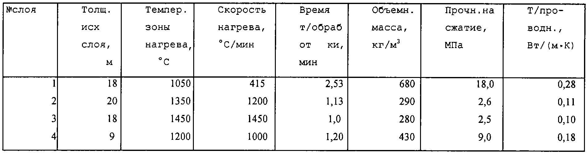 Пример 1. На жестком термостойком основании формируют слой суглинков и/или глины толщиной 20±5 мм, перемещают его горизонтально и подают в термоизолированную зону нагрева, где происходит его вспенивание. Процесс вспенивания шихты сопровождается интенсивным поглощением тепловой энергии. Оптимальную температуру зоны нагрева поддерживают, исходя из баланса тепловой энергии и обеспечивая температуру выше температуры спекаемости. Выбранная интенсивность теплового удара достигается соотношением температуры зоны нагрева (1050-1450°С), толщины слоя (15-30 мм) и скорости его подачи (0,01-0,1 м/с). На выходе получают пористый материал однородной структуры, находящийся в вязкопластичном состоянии. На его поверхность насыпают второй слой холодной шихты, высота которого не обязательно равна высоте первого. Заготовку перемещают в исходное для первого слоя положение, либо поворачивают основание на 180° в горизонтальной плоскости для реверсной подачи, после чего процесс повторяют. Очевидно для разных слоев режим термообработки может быть различен. В зоне нагрева проходного типа может формоваться блок длиной до нескольких метров, при этом термообработке подвергается не весь слой, а некоторая его часть, равная по площади зоне нагрева. Тем не менее, при выбранном режиме термообработки все участки слоя получают одинаковое количество тепловой энергии. В частном случае трехслойного блока внешние (несущие) слои получены при скорости нагрева величиной 415 5°С/мин, а внутренний (теплозащитный) – при 1450 10 С/мин. Существенно, что все описанные в примере действия осуществляют до стадии стабилизации и охлаждения нижнего слоя, пока процесс стеклования еще не закончен, чтобы обеспечить надежное спекание материала при нагревании и связывание слоев в единый блок. Полученную заготовку (корж) размером 0,6 х 1,6 м и толщиной от 65 до 108 мм стабилизируют и охлаждают в заданном режиме. Готовое изделие представляет собой пористую трехслойную стеклокерамическую плиту, выдерживающую в вертикальном положении сжимающую нагрузку до 7,5 МПа (75 кг/см2) и пригодную для выполнения несущих конструкций.