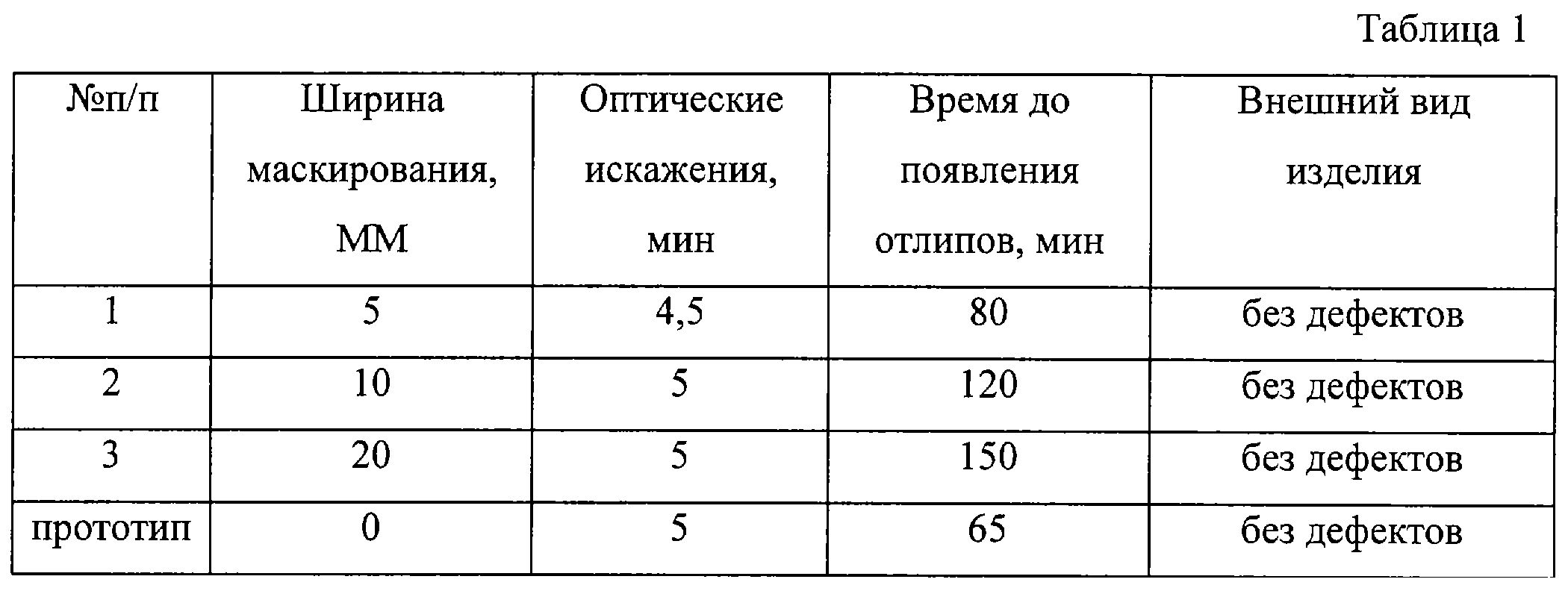 Анализ приведенных данных показывает, что время появления расслоения увеличивается в 1.2-2 раза и, следовательно, предлагаемый способ позволяет получать изделия с более высокой стойкостью к воздействию тепла и влаги и оптическими искажениями на уровне прототипа.