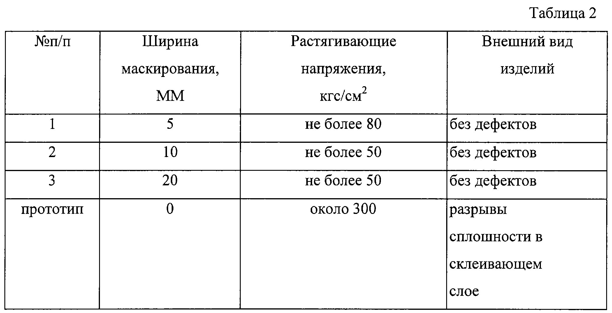 (57) Реферат: Изобретение относится к способам изготовления многослойных стекол и может быть использовано в авиационной технике, машиностроении, народном хозяйстве. Технический результат изобретения – увеличение стойкости изделия к появлению расслоения при воздействии тепла и влаги, возможность изготовления бездефектных изделий с использованием склеивающих композиций с большой усадкой, уменьшение величины оптических искажений детали. Способ изготовления многослойного стекла включает сборку пакета из листов стекла, установку пакета под углом к горизонту, заполнение межстекольного пространства композицией, полимеризующейся под действием ультрафиолетового облучения, удаление воздушного пузыря из межслойного пространства, герметизацию технологической щели для заливки композиции, маскирование поверхности пакета по его периметру, воздействие на поверхность пакета ультрафиолетовым облучением. После облучения маску удаляют и проводят повторное ультрафиолетовое облучение всей поверхности пакета. Маскирование поверхности пакета осуществляют на ширину 5-20 мм от края листа. 1 з.п. ф-лы, 2 табл. Предлагаемое изобретение относится к способам изготовления многослойных стекол и может быть использовано в авиационной технике, машиностроении, народном хозяйстве. Известен способ изготовления многослойного стекла триплекс с применением жидких олигомер-мономерных фотоотверждаемых компонентов путем сборки стеклопакета с помощью эластичной герметизирующей прокладки, сжатия, заполнения зазора жидкой смесью и последующего фотоотверждения, в котором сборку стеклопакета ведут при одновременном введении между стекол эластичной герметизирующей прокладки и ее сжатии по периметру изделия прозрачными калибрами, устанавливая их с шагом 50-200 мм, а фотоотверждение проводят на профилированной форме. Прозрачные калибры выполнены из силикатного или органического стекла и соединены между собой упругим элементом. Эластичная герметизирующая прокладка выполнена в виде П-образного либо Т-образного профиля с эластичным наконечником в виде трубки, гофра или ласточкиного хвоста [1]. Недостатками способа является недостаточная стойкость изделия к появлению расслоения при воздействии тепла и влаги, а также оптические искажения в изделиях сложной формы. Наиболее близким аналогом, взятым за прототип, является способ производства многослойного стекла сложных конфигураций [2]. Способ включает установку на расстоянии друг от друга двух и более листов стекла, их фиксацию и герметизацию по периметру, установку пакета перед заливкой под углом к горизонтали, заполнение через заливное отверстие воздушного промежутка между стеклами полимерными смолами, полимеризующимися под действием ультрафиолетового облучения, с герметизацией заливного отверстия, в котором непрерывную компенсацию избыточного давления столба заливного полимера, удаление воздушного пузыря осуществляют путем вакуумирования. Вакуумирование пакета осуществляют с помощью иглы, проходящей через уплотнительный кант пакета. Недостатками способа-прототипа является недостаточная стойкость многослойного стекла к появлению расслоения при действии на изделие тепла и влаги, а также невозможность получения бездефектных изделий при использовании композиций с большой усадк