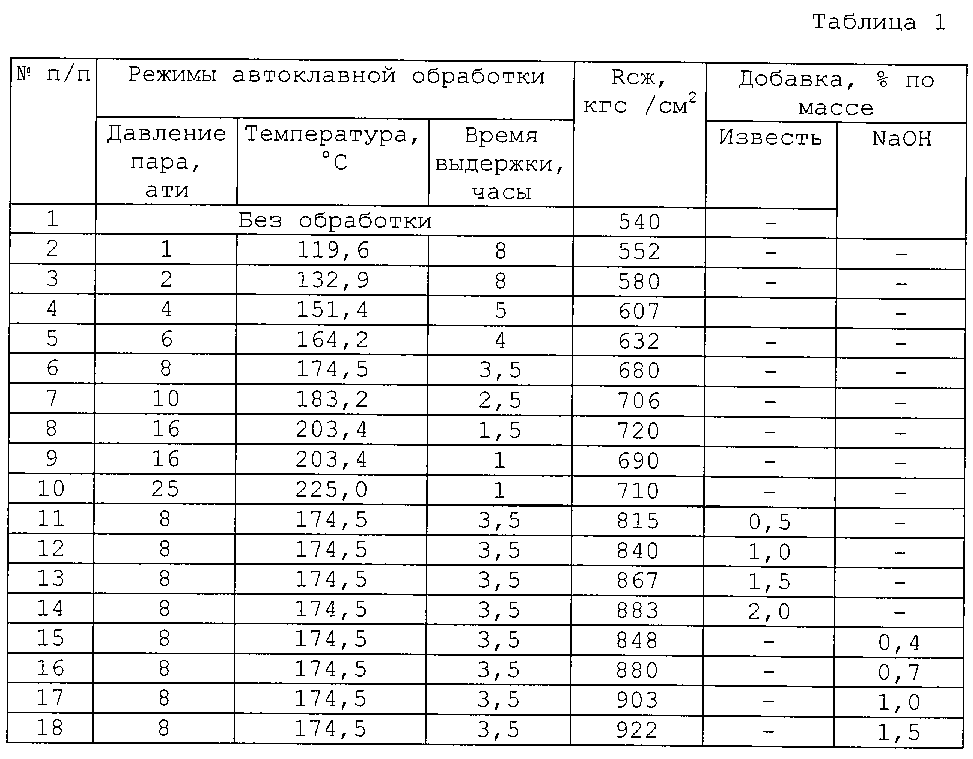 В качестве примеров, подтверждающих эффективность предлагаемого способа получения цементного бетона путем предварительной автоклавной обработки силикатного заполнителя, в таблице 1 приведены результаты испытаний цементно-песчаных образцов. Установлено, что модифицирование песка автоклавной обработкой позволяет повысить прочность образцов до 33%, а гидротермальная обработка песка в присутствии 2,0% извести увеличивает прочность цементно-песчаных образцов относительно контрольных на 63%. Добавка 1,5% гидроксида натрия позволяет повысить прочность образцов на 70%.