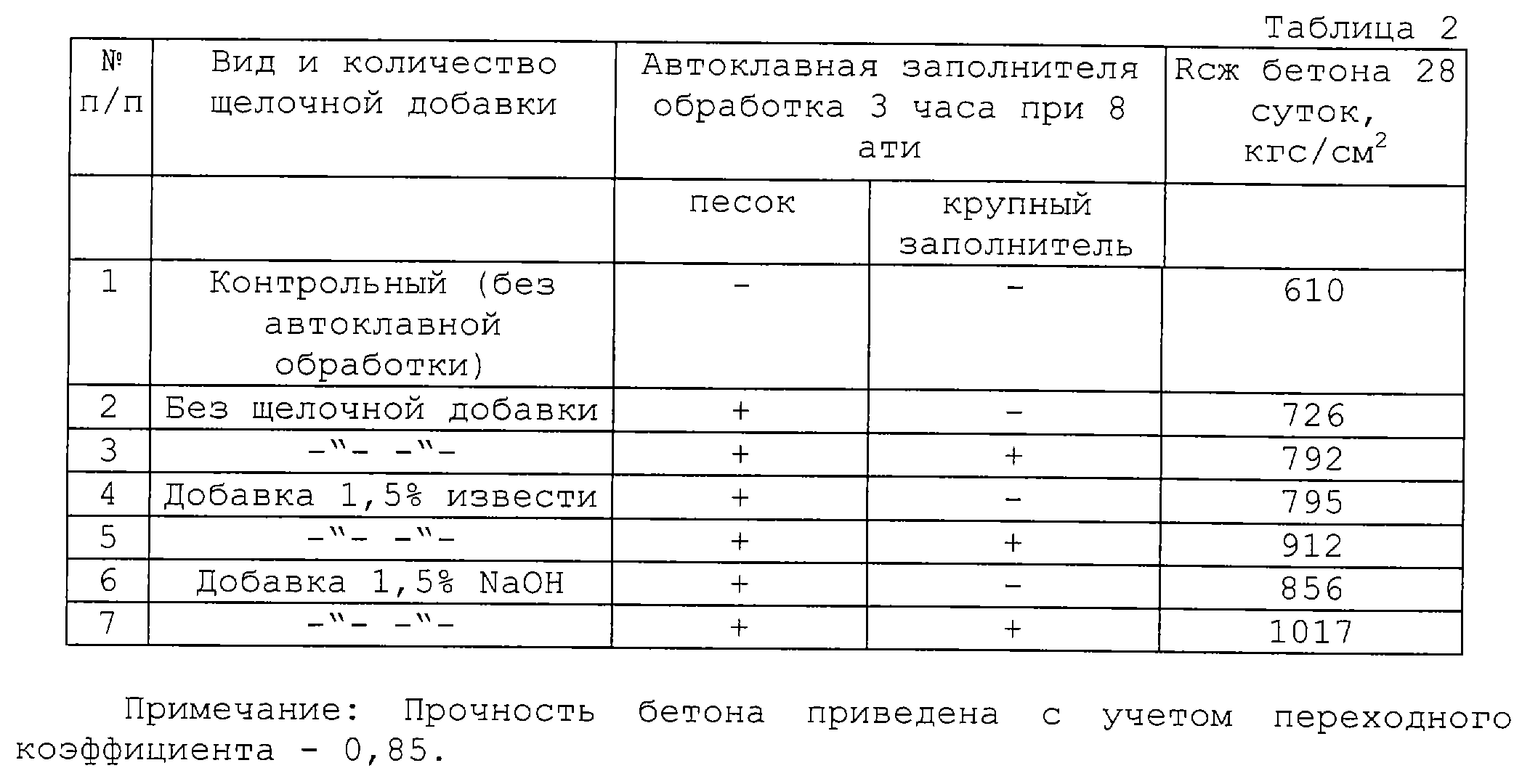 Зависимость прочности образцов бетона от предварительной обработки в автоклаве заполнителя в присутствии щелочной добавки и без нее приведена в табл. 2.
