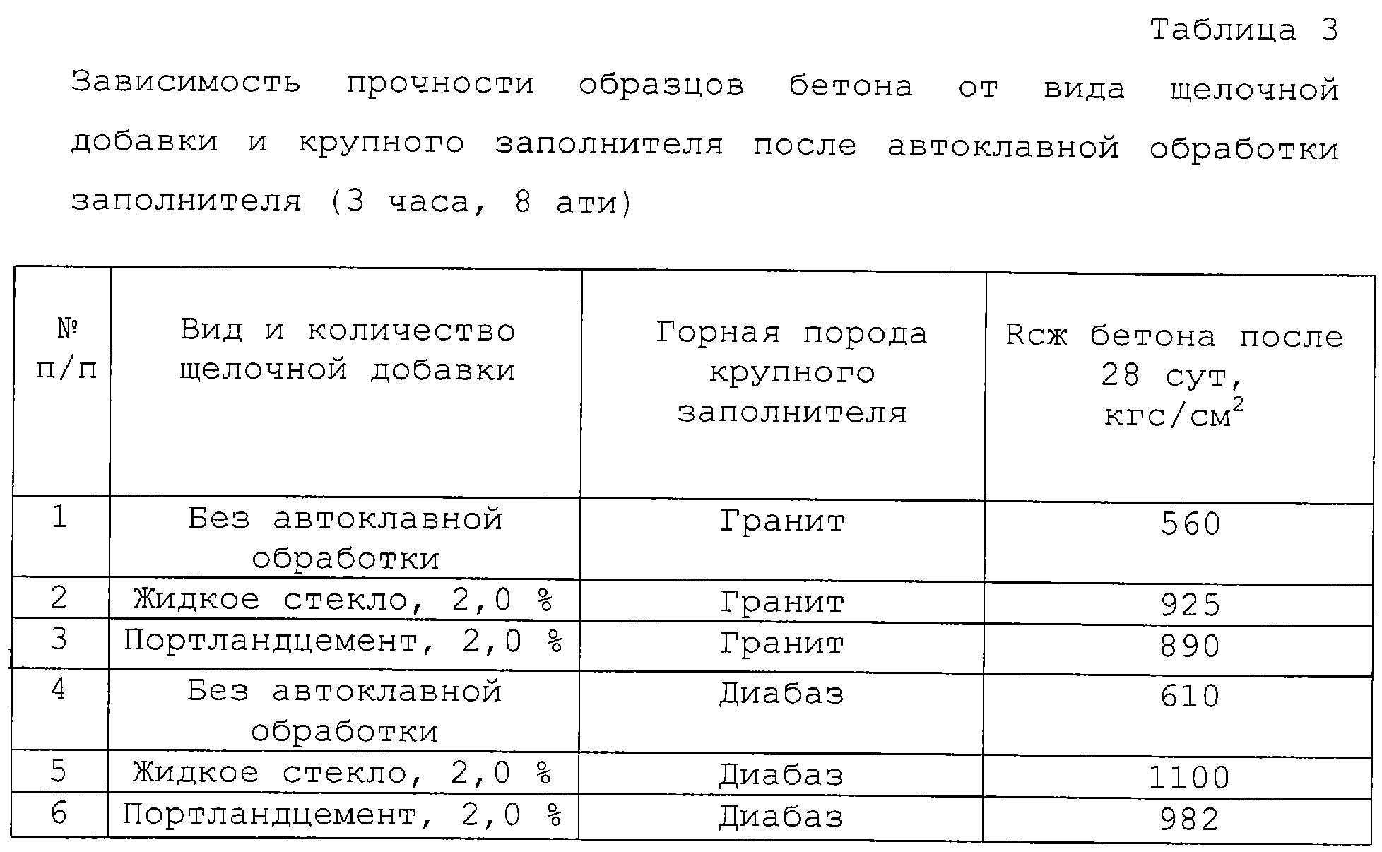 В таблице 3 приведены результаты испытаний бетона, изготовленного на крупном заполнителе из гранита и диабаза, в зависимости от вида щелочной добавки, в качестве которой использовались портландцемент и жидкое стекло. Для сравнения приведены результаты испытаний бетона на граните и диабазе, не подвергавшемся автоклавной обработке. Из представленных данных следует, что прочность бетона с добавкой портландцемента может повыситься на 61%, а с добавкой жидкого стекла на 80% по сравнению с контрольными образцами.