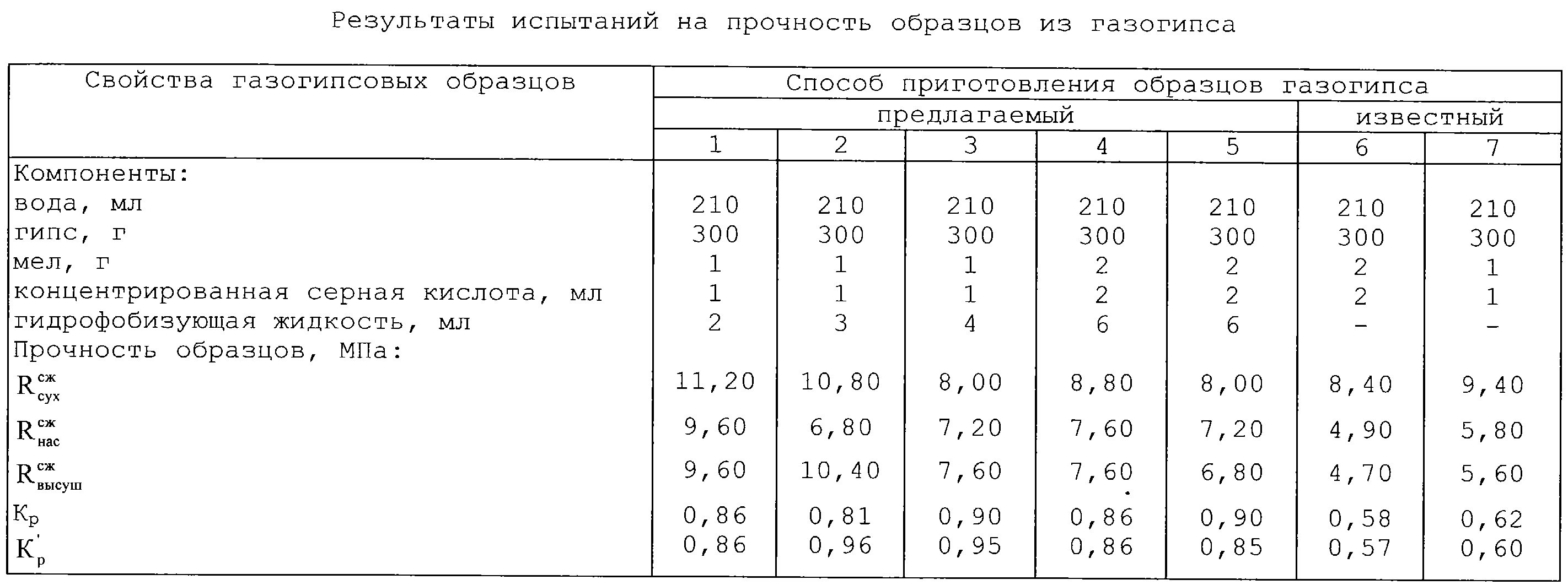 ПРИМЕР 1. В 210 мл воды, нагретой до температуры 37-40 С, вводят 3 мл гидрофобизующей жидкости (ГБЖ) и 1 мл концентрированной серной кислоты с плотностью 1,80 г/см3, что составляет для этих компонентов соответственно 1,25 и 0,84%. Приготовленным композиционным раствором затворяют 300 г гипсового вяжущего, содержащего 1 г (0,33%) карбонатную добавку – мел, при этом водогипсовое отношение составляет 0,7. Полученную смесь перемешивают механической мешалкой в течение 10-15 с и заливают в формы для стандартных балочек размером 4 4 16 см.