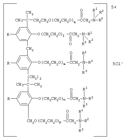 2. Способ получения пента{[поли(этиленокси)карбонилметил]аммониевые} производных трехядерных трифенолов формулы, указанной в п.1, заключающийся во взаимодействии монохлоруксусной кислоты с оксиэтилированным продуктом конденсации алкилфенола с 4,4-диметилдиоксаном-1,3 формулы