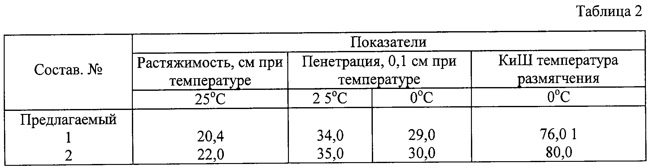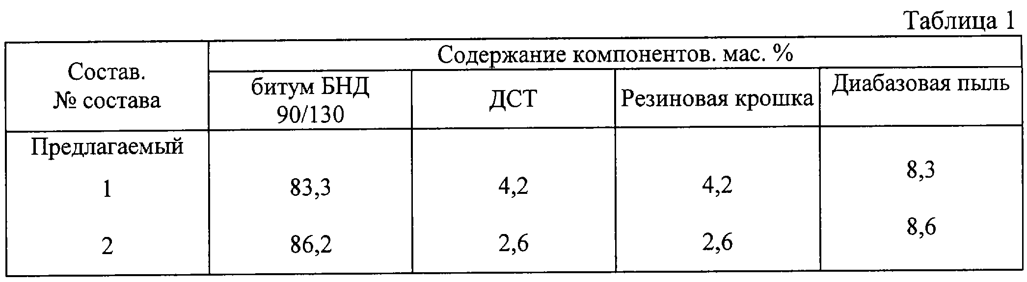(57) Реферат: Изобретение относится к области ремонта дорожных бетонных покрытий и предназначено для заделки швов и трещин в асфальтобетонных и цементобетонных покрытиях автомобильных дорог. Технический результат – упрощение способа приготовления битумной мастики с улучшенными физико-механическими свойствами. Способ получения битумной мастики заключается в введении при перемешивании в разогретый битум дивинилстирольного термоэластопласта, причем битум разогревают до температуры 120-140оС, после введения дивинилстирольного термоэластопласта перемешивают в течение 3-5 ч, добавляют резиновую крошку и непрерывно перемешивают в течение часа, затем вводят диабазовую пыль и перемешивают 1 ч, при этом компоненты мастики берут в следующем соотношении, мас.%: битум БНД 90/130 83,3-86,2; дивинилстирольный термоэластопласт 2,6-4,2; резиновая крошка 2,6-4,2; диабазовая пыль 8,3-8,6. 2 табл. Изобретение относится к области ремонта дорожных бетонных покрытий и предназначено для заделки швов и трещин в асфальтобетонных и цементобетонных покрытиях автомобильных дорог. Известен способ получения битумной мастики [SU 465459, 1975]. Термоэластопласт растворяют в газовом конденсате в соотношении (вес.ч.) 1:5, где он растворяется в течение 2-3 ч. Затем раствор термоэластопласта вводят в разогретый до 110-120°С битум марки БНД 60/90 или БНД 90/130 при интенсивном перемешивании. Термоэластопласт вводится в битум при соотношении (вес.ч.) 1-2:100. В полученную смесь вводят при непрерывном перемешивании асбестовую муку при соотношении (вес.ч.) 4:1. Последний компонент – портландцемент М400 вводятся в смесь битума, модифицированного термоэластопластом, с асбестовой мукой при соотношении (вес. ч.) 4:1. Недостатком известного способа получения битумной мастики являются низкие эксплуатационные свойства мастики. Наиболее близким к изобретению по технической сущности является способ получения мастики, описанный в SU 802336 А, С 08 L 95/00, 07.02.1981, 3 с. /1/, заключающийся в том, что в разогретый до 100-110оС битум БНД 90/130 вводят раствор ДСТ-30 в газовом конденсате и при постоянном перемешивании в полученную смесь сначала добавляют асбестовую муку, а затем вводят шлифовальную пыль, при этом компоненты мастики берут в соотношении, вес.%: битум 59,0-65,0, дивинилстирольный термоэластопласт 5,2-5,6, газовый конденсат 11,4-13,8, асбест 9,0-11,0, шлифовальная пыль 9,0-11,0. Недостатком данной битумной композиции является использование газового конденсата, который пожаро- и экологически небезопасен. Задачей, решаемой предлагаемым изобретением, является пожаро- и экологически безопасное приготовление битумной мастики с улучшенными физико-механическими характеристиками. Технический результат – упрощение способа приготовления битумной мастики с улучшенными физико-механическими свойствами. Указанный технический результат достигается тем, что в способе получения битумной мастики, включающем введение в разогретый битум дивинилстирольного термоэластопласта, битум разогревают до температуры 120-140°С, после введения дивинилстирольного термоэластопласта перемешивают в течение 3-5 ч, добавляют резиновую крошку, непрерывно перемешивают в течение часа, затем вводят диабазовую пыль и перемешивают 1 ч, при этом компоненты мастики берут в следующем соотношении, мас.%: Битум БНД 90/130 83,3-86,2 Дивинилстирольный термоэластопласт 2,6-4,2 Резинов