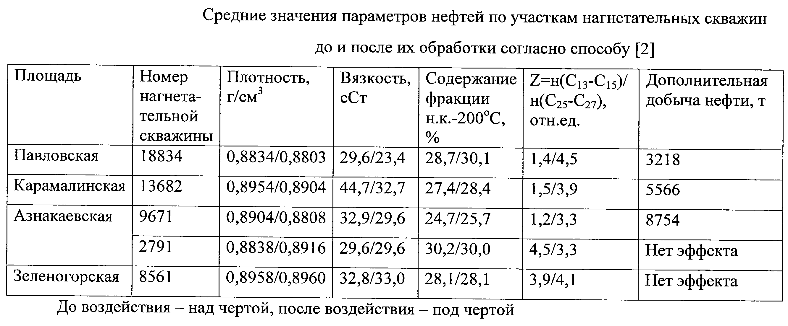(57) Реферат: Изобретение относится к нефтехимии, а именно способу оценки эффективности осадкогелеобразующих технологий добычи нефти на поздней стадии разработки месторождений, и предназначено для использования в нефтедобывающей промышленности. Задачей изобретения является расширение арсенала средств. Сущность изобретения: способ включает отбор поверхностных проб нефти, стабилизацию нефтей, определение значений плотности, вязкости и содержания фракции с температурой кипения до 200°С и сравнение этих значений для нефтей из одних и тех же скважин до и после применения осадкогелеобразующих составов. Если нефть характеризуется первоначальными или слабо измененными свойствами по сравнению с нефтью до воздействия, то применяемая технология обеспечивает охват пласта заводнением, либо селективную изоляцию выработанного пласта и подключение ранее недренируемых менее проницаемых зон того же пласта или нового пласта. 1 табл. Изобретение относится к нефтехимии, а именно способу оценки эффективности осадкогелеобразующих технологий добычи нефти на поздней стадии разработки месторождений, и предназначено для использования в нефтедобывающей промышленности. В связи с высокой обводненностью продуктивных месторождений возникла проблема повышения эффективности их разработки, которая достаточно успешно решается путем воздействия на пласты через нагнетательные скважины осадкогелеобразующими технологиями, позволяющими изменить направления фильтрационных потоков, тем самым, увеличивая охват пласта заводнением или селективно изолируя выработанный пласт. Известны методы выделения работающих интервалов разреза в добывающих и нагнетательных скважинах путем анализа нефти из добывающих скважин. К ним относится метод фотокалориметрии нефти и определения содержания в ней микрокомпонентов [1. Руководство по применению геолого-геофизических, гидродинамических и физико-химических методов для контроля разработки нефтяных месторождений. РД 39-4-699-82, с.36-41, приказ Министерства нефтяной промышленности № 227 от 6 мая 1982 г.]. Значение коэффициента светопоглощения (Ксп) связано с содержанием в нефти смолисто-асфальтеновых веществ. Однако этот метод нельзя использовать, если нет достаточных материалов, чтобы составить обоснованную картину распределения Ксп по площади залежи в каждом из пластов многопластового объекта в начале и в процессе его разработки. Он не всегда применим даже к соседним пластам, не говоря об отдельных зонах одного и того же пласта. Так, в приведенном в [1] примере, на Западно-Сургутском месторождении нефть пласта BC1 имеет Ксп в пределах 543-301 единиц, а нефть пласта ВС10 – от 120 до 310 единиц. Задачей изобретения является новый, расширяющий арсенал известных способов, способ оценки эффективности осадкогелеобразующих технологий добычи нефти на основе анализа физико-химических свойств нефтей, отбираемых скважинным способом. Задача решается предлагаемым способом оценки эффективности осадкогелеобразующих технологий добычи нефти путем сравнения плотности и вязкости нефтей, а также содержания фракции от начала кипения (н.к.) до 200°С в нефтях, отобранных с устья скважин участка до и после обработки нагнетательной скважины осадкогелеобразующим составом. Снижение значений плотности, вязкости нефтей, увеличение содерж