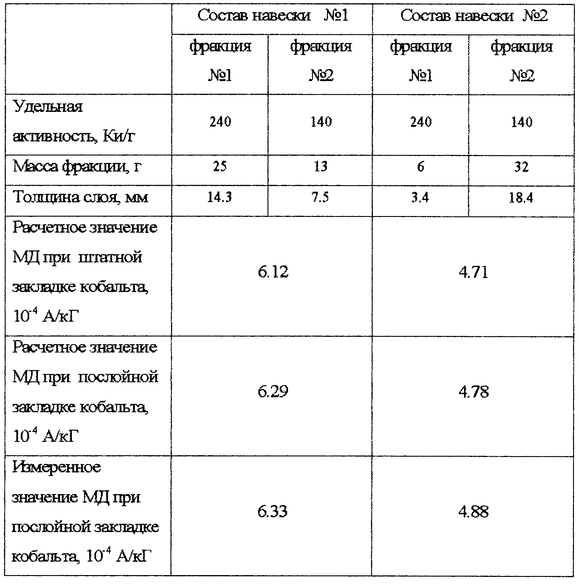 Как видно из таблицы, расчетные и измеренные значения МД источников при послойной закладке облученного материала практически совпадают, разница составляет 0,6%. Измеренное значение МД источника с послойной закладкой радионуклида с заданным значением суммарной активности выше на 3,9% измеренного значения МД источника со смешанной закладкой радионуклида с той же суммарной активностью.
