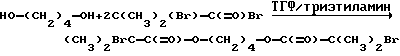 Пример 1Получение дифункционального инициатора полимеризации Дифункциональный инициатор получают согласно следующей реакционной схеме: ![]() Для этого, 18 г (0,2 моль) 1,4-бутандиола смешивают со 100 г тетрагидрофурана (ТГФ) и оставляют смесь уравновешиваться в течение 10 минут при комнатной температуре. Затем медленно, в течение 30 минут, добавляют 40,4 г (0,4 моль) триэтиламина таким образом, чтобы температура раствора резко не повышалась. Затем очень медленно, в течение 3 часов, и при охлаждении до температуры 5oС, добавляют 92 г (0,4 моль) 2-бромизобутирилбромида. Во время этого добавления наблюдают постепенное пожелтение реакционного раствора. Выдерживают при перемешивании в течение ночи при температуре 25oС, затем оставляют температуру постепенно повышаться до комнатной температуры. Реакционный раствор концентрируют путем выпаривания тетрагидрофурана и остаток осаждают в воде. Затем водную фазу экстрагируют три раза с помощью диэтилового эфира, после чего эфирную фазу сушат над сульфатом магния. После выпаривания диэтилового эфира получают, таким образом, 63 г бис(н-бутил-1,4-бромизобутирата), что соответствует выходу 80%. Пример 2 Получение трехблочного сополимера поли(метилметакрилат -b- бутилакрилат-b-метилметакрилат) Стадия I: Полимеризация бутилакрилата В герметичном реакторе, в отсутствие кислорода и при подаче азота, смешивают 0,078 г (2 10-4 моль) полученного в примере 1 дифункционального инициатора, 2,9 10-4 моль CuBr, 5,7 10-4 моль 2,2′-бипиридина и 30 г бутилакрилата. Нагревают в атмосфере азота до температуры 120oС, прекращают подачу азота и выдерживают при этой температуре в течение 5 часов.