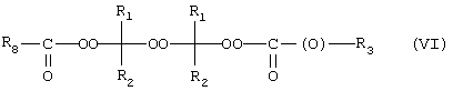 Кроме того, настоящее изобретение включает следующие смешанные сложные дипероксиэфиры и сложные пероксиэфиры пероксикарбонатов, имеющие общую формулу VI: