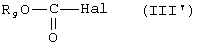 Предпочтительные галогенангидриды кислот включают галогенангидриды, в которых R3 представляет собой линейную или разветвленную C1-C12-алкильную, циклоалкильную, арильную, аралкильную, алкарильную группу, причем арильная группа предпочтительно является фенильной группой. Типичными примерами являются галогенангидриды кислот, получаемые из следующих карбоновых кислот: уксусная кислота, фенилуксусная кислота, феноксиуксусная кислота, пропановая кислота, изомасляная кислота, бензойная кислота, 2-метилбензойная кислота, 2-метилбутановая кислота, 2-бутеновая кислота, 3-фенилпропеновая кислота, 2,2-диметилпропановая кислота, 2,2-диметилбутановая кислота, 2,2-диметилпентановая кислота, 2-этилбутановая кислота, 3,5,5-триметилгексановая кислота, 2-этилгексановая кислота, неогексановая кислота, неогептановая кислота, неодекановая кислота, октановая кислота, нонановая кислота, лауриновая кислота, 3,5,5-триметилпентанодионовая кислота, гександионовая кислота, 3,5,5-триметилгександионовая кислота, 2,4,4-триметилгексан-дионовая кислота, декандионовая кислота, ундекандионовая кислота, додекандионовая кислота, циклогексанкарбоновая кислота, 1,4-циклогександикарбоновая кислота, циклогексан-1,4-диуксусная кислота, малеиновая кислота, лимонная кислота, метилянтарная кислота, цитраконовая кислота, фумаровая кислота, щавелевая кислота, терефталевая кислота, пропеновая кислота и фталевая кислота, а также их соответствующие сложные метиловые эфиры, сложные этиловые эфиры, сложные н-пропиловые эфиры, сложные изопропиловые эфиры, сложные н-бутиловые эфиры, сложные втор.-бутиловые эфиры, сложные изобутиловые эфиры, сложные этиленгликолевые эфиры и сложные пропиленгликолевые эфиры. Предпочтительно галоген представляет собой хлор.