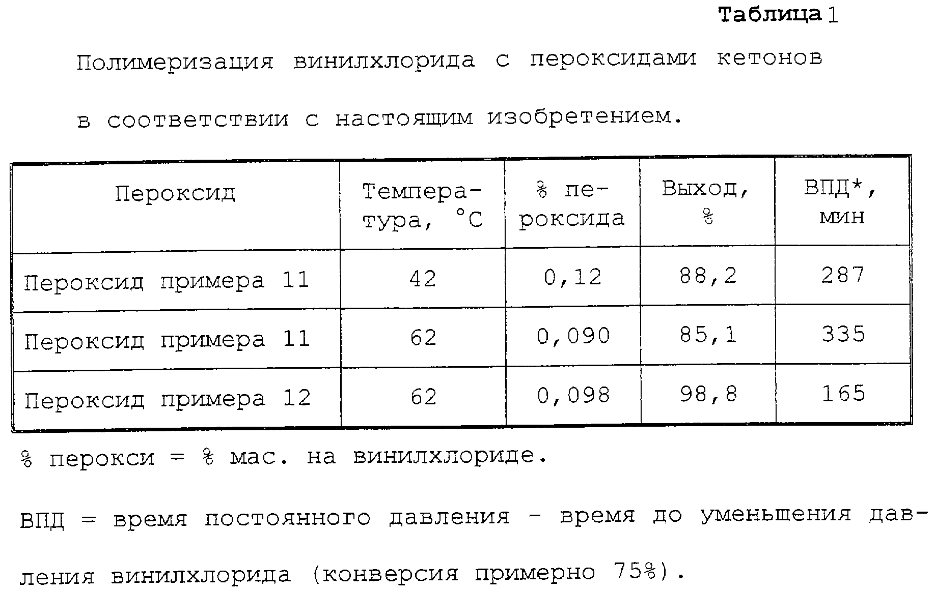 Сложные пероксиэфиры настоящего изобретения с температурами в интервале 40-60 С, при которых период полураспада составляет 1 час, были оценены с хорошими результатами при полимеризации винилхлорида. Поливинилхлорид получают в соответствии с экспериментальной методикой, в которой используется автоклав объемом 5 литров, конверсию во времени измеряют с помощью “методики меченого бутана” (T.Y. Xie, A.E. Hamielek, P.E. Wood, O.R. Woods and H. Westraijze, J. Appl. Pol. Sci., vol.41 (1990)). В реакционный сосуд из нержавеющей стали объемом 5 литров, снабженный 1 отражательной перегородкой, трехлопастной мешалкой (n=450 об/мин), датчиком давления, продувкой азотом и устройством для отбора пробы для “методики меченого бутана”, загружают 2700 г деминерализованной воды, 0,15% Gohsenol КР08 (1,0125 г) на винилхлориде и буфер: 1 г Nа2НРO4 ех Baker, no. 0303 + 1 г NaH2PO4 ex Baker, no. 0306. Сосуд закрывают и азотом создают давление 15 бар. Сосуд открывают и затем азотом создают давление 5 бар, по меньшей мере, 3 раза. Затем в сосуд помещают сложный пероксиэфир настоящего изобретения в качестве инициатора.
