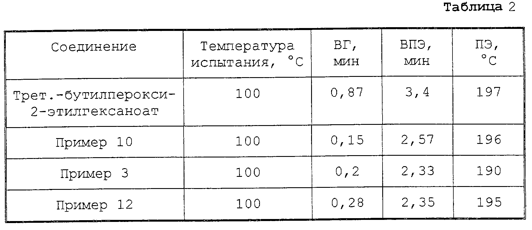 Чтобы определить отверждающие свойства пероксисоединений настоящего изобретения в качестве отверждающего агента для сложного ненасыщенного полиэфира, проведено сравнение с обычным отверждающим агентом трет.-бутил-пер-2-этилгексоноатом (обычное соединение).