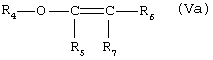 Конкретными примерами простого алкилвинилового эфира общей формулы Va являются: винил-2,2-бис(винилоксиметил)-бутиловый эфир, 2-метокси-2-бутен, н-пропилвиниловый эфир, 1-этокси-4-метил-1-нонен, трет.-амилвиниловый эфир, 2,2-бис(4-винилоксифенил)пропан, гексадецилвиниловый эфир, метилвиниловый эфир, 4-метилгексилвиниловый эфир, 2-(2-этоксиэтокси)этилвиниловый эфир, 2-метоксиэтилвиниловый эфир, 2-винилоксиэтанол, 4-метил-2-деценилвиниловый эфир, бензил-1-метилвиниловый эфир, бутандиолдивиниловый эфир, трет.-бутилвиниловый эфир, изобутилвиниловый эфир, циклогександиметанолдивиниловый эфир, циклогексилвиниловый эфир, дивиниловый эфир этиленгликоля, 1-этокси-4-(1-этоксивинил)-3,3,5,5-тетраметилциклогексен, изопропилвиниловый эфир, этилвиниловый эфир, дивиниловый эфир тетраэтиленгликоля, 1,1,3-триметоксипропен, 1-метокси-1-бутен-3-ин, гептилвиниловый эфир, 4-(1-этоксивинил)-3,3,5,5-тетраметилциклогексанон, 2-бутоксиэтилвиниловый эфир, дивиниловый эфир, 1,3-дивинилокси-2,2-диметилпропан, 4-винилоксибутанол, дивиниловый эфир диэтиленгликоля, 4-(винилоксиметил)циклогексилметанол, изопентилвиниловый эфир, моновиниловый эфир диэтиленгликоля, н-бутилвиниловый эфир, 1,4-бис(2-винилоксиэтил)бензол, дивиниловый эфир гександиола, 1-метокси-1,3-бутадиен, децилвиниловый эфир, 4-(аллилоксиметил)-1,3-диоксолан-2-он, 1,1-диэтилпропилвиниловый эфир, 2-метоксивинилбензол, октилвиниловый эфир, бис(винилокси)метан, 1,4-диметокси-1,3-бутадиен, 2,З-диметокси-1,3-бутандиен, дивиниловый эфир триэтиленгликоля, пентилвиниловый эфир, октадецилвиниловый эфир, 2-метоксипропен, метилвиниловый эфир триэтиленгликоля, 2,3-эпоксипропилвиниловый эфир, додецилвиниловый эфир, 1,1-бис(винилокси)бутан, гексилвиниловый эфир, 6-винилоксигексанол, (z)-1-метокси-1-бутен-3-ин, фенилвиниловый эфир, 2-этилгексилвиниловый эфир, дивиниловый эфир поли-ТГФ, дивиниловый эфир pluriol-E-200, тривиниловый эфир триметилолпропана, аминопропилвиниловый эфир, 2-диэтиламиноэтилвиниловый эфир, 2-этоксипропен, 2-изобутоксипропен, 2-этокси-2-бутен, 2-изобутокси-2-пропен и этилпропениловый эфир. Следует отметить, что если используется дивиниловый эфир, будут образовываться такие продукты, которые имеют два фрагмента формулы IV, которые связаны через общую группу R4.