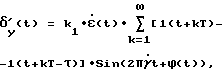 При одноканальном управлении, например, по методу пропорциональной навигации, используемому в прототипе, управляющий сигнал Uy‘(t) в одном из каналов управления вращающимся снарядом имеет следующий вид:![]() а угол отклонения рулей соответственно:![]() где Т – период следования импульсов подсвета (для частоты подсвета, например, ![]() длительность импульсов подсвета; амплитуда угловой скорости линии визирования цели; фаза угловой скорости линии визирования цели; величина линейной зоны головки самонаведения по угловой скорости линии визирования цели, при которой управляющий сигнал, формируемый головкой самонаведения, достигает максимального значения; угловая скорость вращения снаряда;k1 – коэффициент пропорциональности рулевого привода, определяемый при моделировании. При этом первая гармоника сигнала представляющего собой последовательность импульсов единичной амплитуды, следующих на частоте f0=20 Гц, может быть выражена в следующем виде:![]() функция, характеризующая коэффициент использования команды.