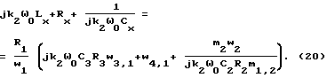 Первую операцию заявленного способа, то есть первое уравновешивание моста, проводят на частоте , где k1 > 1, регулировками двух параметров w3, w4. Угол сходимости по ним равен 90o при прямых линиях уравновешивания, как это следует из выражения (10). Ключ 18 при первой операции разомкнут. По окончании уравновешивания моста уравнение (6) записывается в виде:![]() В соответствии с (14) в конце первого уравновешивания значения параметров w3, w4 получают равными: w4,1=(w1/R1)Rx, (15) w3,1 = Lx (1-1/ k21), (16)где = w1/R1C3R3, (17) = 20CxLx. (18)Из формул (15), (7) следует, что в конце первого уравновешивания получают равенство: w4,1 = w4,0. (19) то есть в конце первой операции получают значение параметра w4, по которому производят отсчет измеряемого активного сопротивления Rx по формуле (7). Вторую операцию заявленного способа (то есть второе уравновешивание моста) проводят на частоте 2 = k2 0 , где k2 < 1, регулировкой параметра m1 при найденных в конце первой операции значениях параметра w4 = w4,1 и параметра w3 = w3,1 (ключ 18 при второй и следующих операциях замкнут). В конце второй операции уравнение равновесия (6) записывается как:![]() При учете (15) – (18) на основе уравнения равновесия (20) значение регулируемого параметра m1 в конце второй операции получают равным: m1,2 = Cx/(1-k22/k21), (21)где = m2w2R1/w1R2C2. (22)Третью операцию (то есть третье уравновешивание моста) проводят на частоте 3 = k3 0 , где k3 > 1, регулировкой параметра w3 при w4 = w4,1 и при m1 = m1,2, определяемом по (21), (22). По достижении нулевого показания нуль-индикатора 14 в конце третьей операции на основе (6) значение параметра w3 получают равным:w3,3 = Lx(1-k22/ k21k23), (23)Четвертую операцию (то есть четвертое уравновешивание моста) проводят на частоте 4 = k4 0, где k4 < 1, регулировкой параметра m1 при w4 = w4,1 и при w3 = w3,3 определяемом по (23), (17). В конце четвертой операции получают значение:m1,4 = Cx/(1-k22k24/k21k23). (24)Аналогично проводят пятое и следующие уравновешивания моста. По проведении l уравновешиваний (l нечетное) получают значение параметра w3, равное: ![]() а при четном l получают значение параметра m1, равное: ![]() В формулах (25), (26) все kj < 1 (что соответствует частотам измерения j < 0) и все ki > 1 (что соответствует частотам измерения i > 0). Значения kj и ki при первых 2 – 4 операциях заявленного способа берут существенно отличающимися от 1, а затем берут в соответствии с границами полосы частот, в которой определяются параметры Rx, Lx, Cx (эта полоса содержит частоту 0).