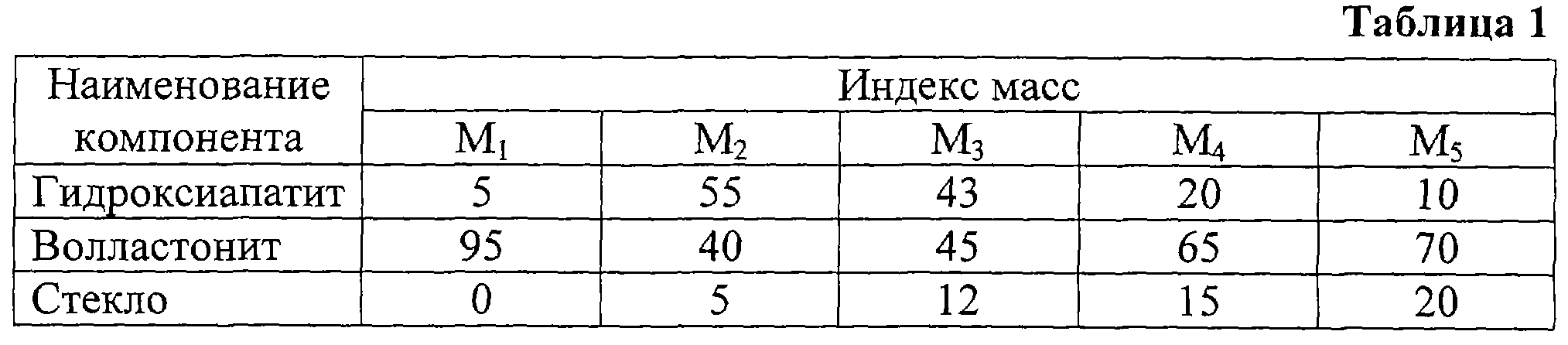 Поставленная задача достигается тем, что шихту, содержащую (маc.%): 5-55 тонкодисперсного гидроксиапатита, 40-95 минерала игольчатой формы с размером кристаллов 0,3-1,0 мм, 0-20 легкоплавкого стекла, смешивают и формуют из нее изделия методом полусухого прессования. Влажность формуемых масс должна составлять 5-7%. Затем изделия помещают на пористую подложку из спеченного кварца или подсыпку из кварцевой крупки с размером зерен 0,5-1,0 мм, сушат и обжигают при 1150-1400 С с выдержкой при конечной температуре 0,5-2,5 ч. В состав шихты входят грубодисперсная часть, представленная минералом, имеющим игольчатое строение кристаллов (например, волластонитом, муллитом или др.) и образующим пространственный жесткий каркас из переплетенных игл, и тонкодисперсная часть – гидроксиапатит и стекло (плавень), способная образовывать маловязкий расплав, вытекающий из изделия в процессе обжига в пористую подложку, в результате чего образуется свободное поровое пространство.