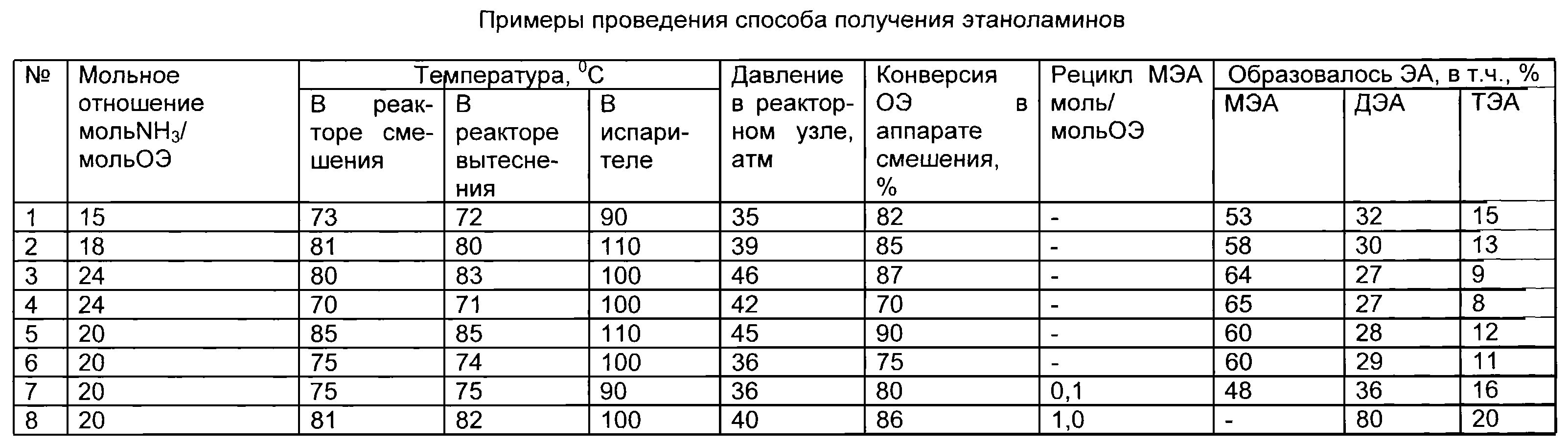 Формула изобретения 1. Способ получения этаноламинов взаимодействием окиси этилена(ОЭ) со стехиометрическим избытком аммиака в реакторе смешения при повышенных температуре и давлении с отгонкой и возвратом избыточного аммиака, отличающийся тем, что синтез этаноламинов осуществляют в системе, включающей реакторы смешения и вытеснения, при температуре 70-85°С, давлении 35-46 атм, мольном соотношении ОЭ:NН3=1:15-25 и конверсии окиси этилена в аппарате смешения не менее 70%, причем отгонку аммиака, возвращаемого на синтез, осуществляют при температуре 90-110°С. 2. Способ по п.1, отличающийся тем, что осуществляют возврат моноэтаноламина(МЭА) в соотношении ОЭ:МЭА=1:0,1-1,0. РИСУНКИ