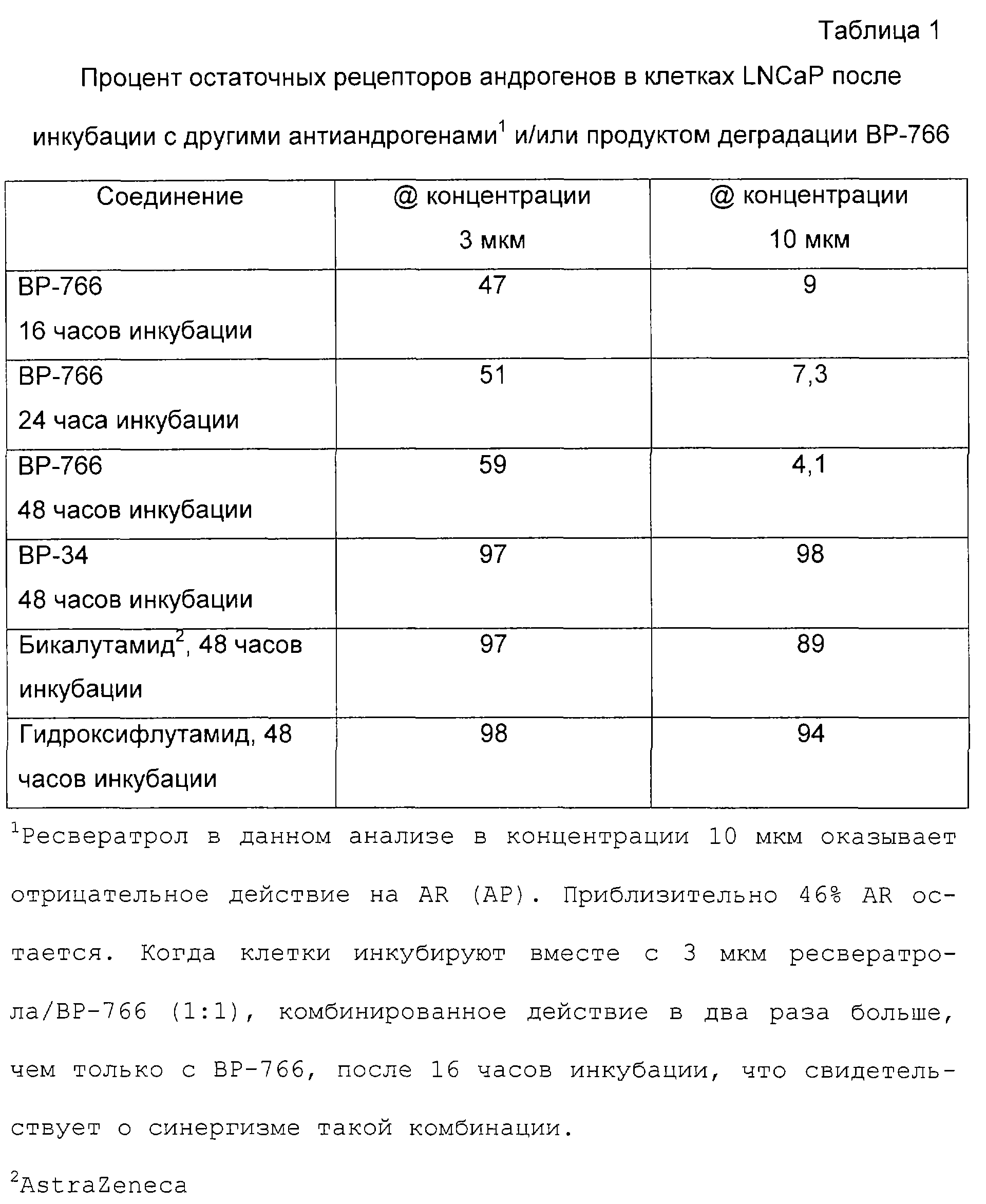 Взаимодействие ВР-766 с рецепторами андрогенов исследовали путем инкубации клеток LNCaP (известно, что они содержат рецепторы андрогенов человека), последующего лизиса клеток и метода вестерн-блоттинга для идентификации и количественной оценки белка андрогенных рецепторов. В таблице 1 приведен средний процент остаточных рецепторов андрогенов, содержащихся в лизате после 16, 24 и 48 часов инкубации клеток с ВР-766, его побочным продуктом биологической деградации, ВР-34, и с двумя стандартными системными антиандрогенами, бикалутамидом и гидроксифлутамидом, все опыты были сдублированы.