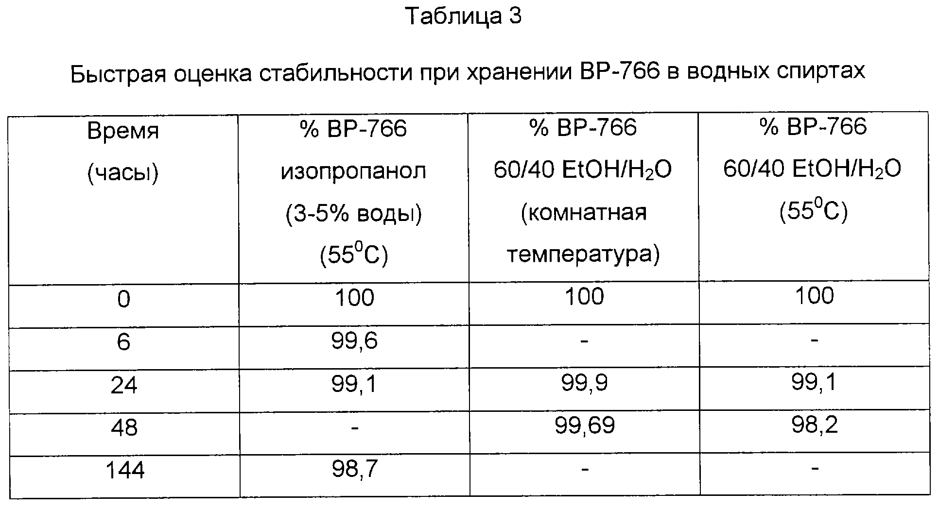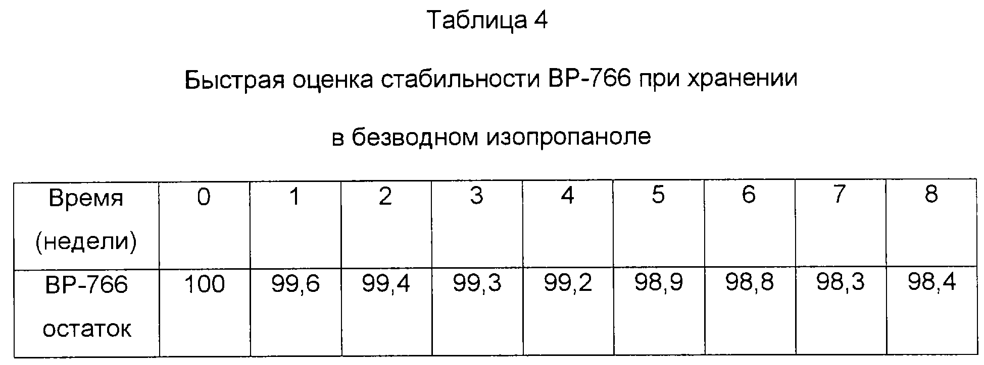 При ускоренном исследовании стабильности растворов композиций с ВР-766 в 97% изопропаноле или смеси этанол : вода (60:40) и инкубировании при 55°С или при комнатной температуре исследования с помощью ВЭЖХ показали лишь небольшие изменения в течение шести дней (таблица 3). Данные, представленные в таблице 4, показывают, что ВР-766 в безводном изопропаноле должен быть стабильным по меньшей мере в течение 5 лет при комнатной температуре (20°С) (Connors, Kenneth A; Amidon, Gordon L.; Stella, Valentino J. Chemical Stability of Pharmaceuticals – A Handbook for Pharmacists. Second Edition, 1986, John Wiley & Sons).