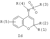 (57) Реферат: Изобретение относится к новым сульфонамидозамещенным бензопирановым производным формулы I ![]() где R(5) находится в одном из положений 5, 6, 7 и 8 и R(1) и R(2) независимо друг от друга означают водород или алкил с 1-6 атомами углерода, R(3) означает R(10)-CnH2n, R(10) означает атом водорода или метил, n означает целое число, равное 0-10, R(4) означает R(13)- СrН2r, причем одна СН2 -группа может быть заменена на -СО-O- или -O-СО- группу, R(13) означает метил или трифторметил, r означает целое число, равное 0-12, R(5) означает -Y-CsH2s-R(18), Y означает -О-, s означает целое число, равное 1-8, R(18) означает водород, трифторметил или фенил, R(6) означает -OR(10d) или -OCOR(10d) группу, R(10d) означает водород или алкил с 1-3 атомами углерода, В означает водород или R(6) и В вместе образуют связь; а также к их физиологически приемлемым солям. Изобретение также относится к способу получения соединений формулы I и к фармацевтической композиции, обладающей K+ – каналблокирующим действием, на основе этих соединений. Технический результат – получение новых соединений и лекарственных средств на их основе в целях профилактики и лечения сердечно-сосудистых заболеваний, в особенности аритмий, лечения язв желудочно-кишечного тракта и лечения заболеваний, протекающих с поносом. 3 с. и 17 з.п. ф-лы, 2 табл. Текст описания в факсимильном виде (см. графическую часть)/ Формула изобретения 1. Сульфонамидозамещенные бензопирановые производные общей формулы I