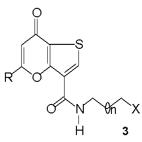 14. Способ по п.13, по которому конденсацию производного 7-оксо-7Н-тиено[3,2-b]пиран-3-карбоновой кислоты 1 с амином 2NCH2(CH2)nCH2X осуществляют в присутствии конденсирующего агента, такого, как дициклогексилкарбодиимид или диэтилцианофосфонат, необязательно, в присутствии поромотирующего агента, такого, как N-гидроксисукцинимид, или 4-диметиламинопиридин, или N,N’-карбонилдиимидазол, в апротонном или хлорированном растворителе при температуре от 10 до 140оС.