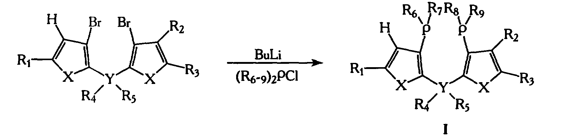 К раствору 3-бромо-2[(3-бромо-5-метил-2-тиенил)метил]-5-метилтиофена (5 г, 0,014 моль) в Et2O (50 мл) при охлаждении до -70°С в атмосфере аргона прибавили 1,6 М раствор BuLi в гексане (19,4 мл, 0,031 моль). Реакционную смесь перемешивали, поддерживая охлаждение, в течение 1.5 ч и прибавили раствор Ph2PCl (6,1 мл, 0,034 моль) в Et2O (10 мл). Охлаждение сняли и оставили перемешиваться на 12 часов. Затем к реакционной смеси прибавили 10%-ный раствор NH4Cl (50 мл), осадок отфильтровали, промыли водой и Et2O. Полученное серое мелкокристаллическое вещество высушили в высоком вакууме и очистили колоночной хроматографией (силикагель 60, бензол). Растворитель удалили. Продукт: белое мелкокристаллическое вещество. Выход: