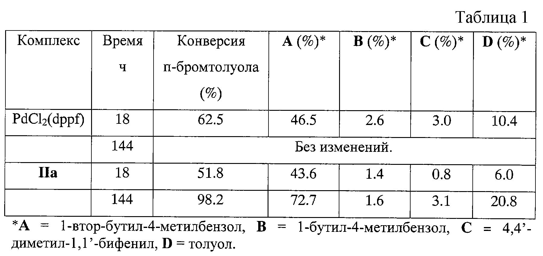 Результаты количественного анализа компонентов реакционной смеси в кросс-сочетании п-бромтолуола и втор-бутилмагнийхлорида (4 ммоль п-бромтолуола, 12 ммоль втор-бутилмагнийхлорида, 0,04 ммоль PdCl2(P-P), 20 Mл Et2O) приведены в табл.1.