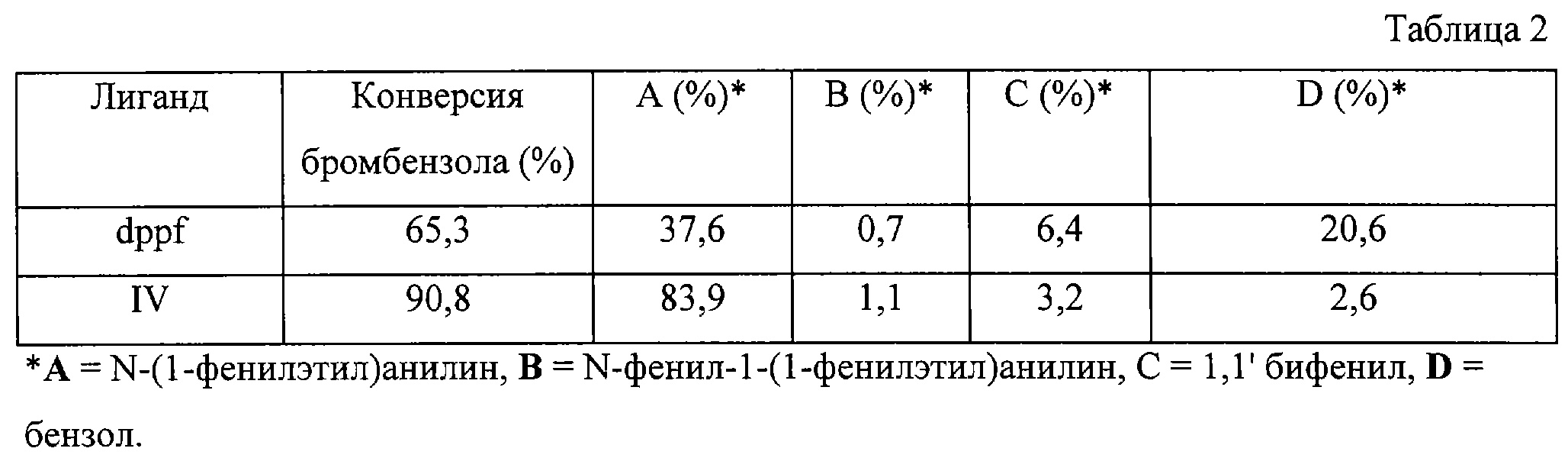 Результаты количественного анализа компонентов реакционной смеси в реакции бромбензола с фенилэтиламином (4 ммоль бромбензола, 4,8 ммоль РhСН(МН2)СН3, 4,8 ммоль NaOtBu, 0,2 ммоль Pd(dba)2, 0,4 ммоль лиганда, 50 мл толуола, 100 °С, 3 часа) приведены в табл.2.