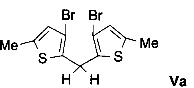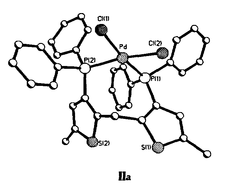 Соединение получили аналогично комплексу IIа исходя из: 2,2′-бис(дифенилфосфино)-5,5′-диметил-3,3′-дитиофена IV (1 г, 0,0018 моль), PdCl2 (0,32 г, 0,0018 моль) и ТГФ (20 мл). Продукт: желтое мелкокристаллическое вещество. Выход: 1 г (76 %). ЯМР 1H (СDCl3, , м.д.):2,20 (с., 6Н, Me); 6,40 (с., 2Н, -СН= тиофенового кольца); 7,40-7,55 (гр. м., 20Н, -СН=, Ph). ЯМР 31Р (CDCl3, , м.д.): 14,25 (с.). Найдено (%): С, 55,29; Н, 3,89. С34Н28Р2S2РdCl2. Вычислено (%): С, 55,18; Н, 3,81.