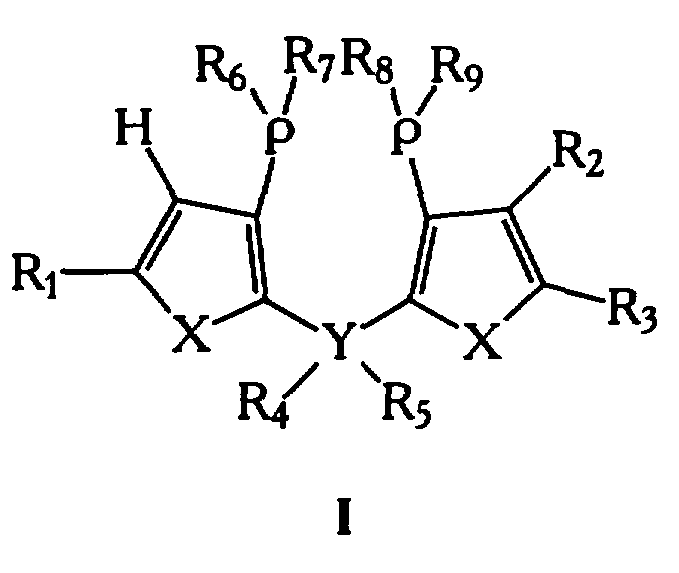 R6, R7, R8, R9 – линейный или разветвленный C1-C20 алкил; циклический С3-C8 алкил; фенил; замещенный арил или гетарил, где заместители – это линейный или разветвленный C1-C20 алкил, галоген; OR14, где R14 – водород, линейный или разветвленный C1-С20 алкил, фенил, замещенный арил; NR15R16 (R15=R16 или R15 R16), где R15 и R16 – линейный или разветвленный С1-С20 алкил, фенил, замещенный арил; SR17, где R17 – линейный или разветвленный C1-C20 алкил; R6 и R7 (R8 и R9) могут быть связаны мостиком (OR18O, где R18 – 1,1′-бинафтил; кислородным; серным; азотным);